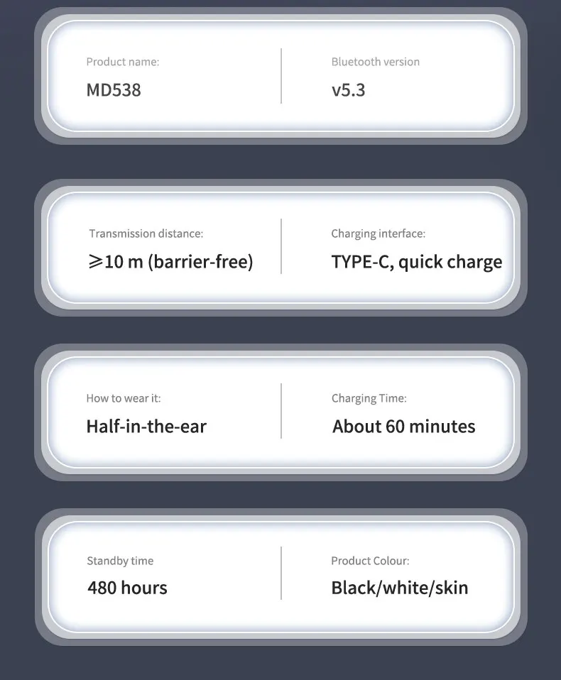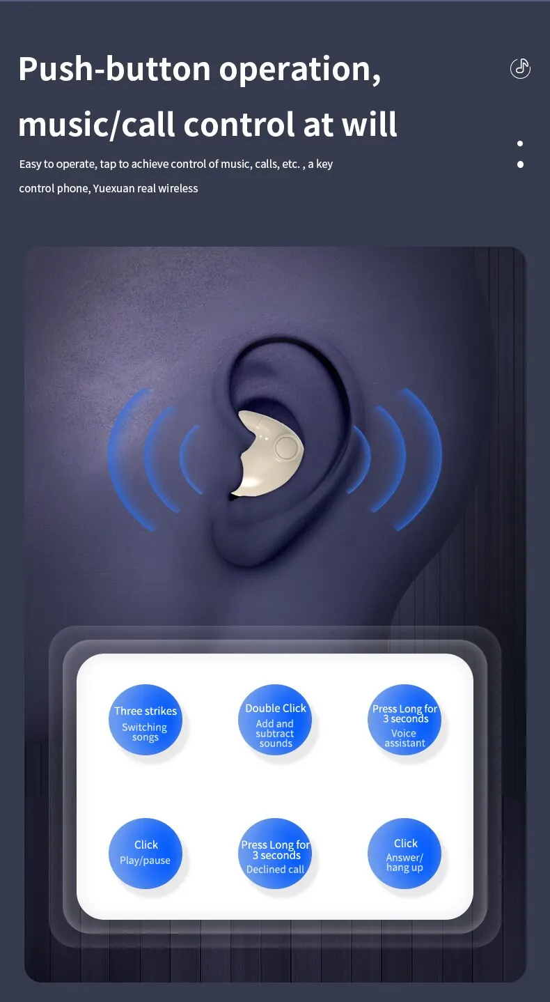 【Invisible and ergonomic design】Invisible headphones are designed according to the shape of the ear, very mini design style, very light, securely fit the hook, suitable for long-term use, will not cause discomfort to the ear.
