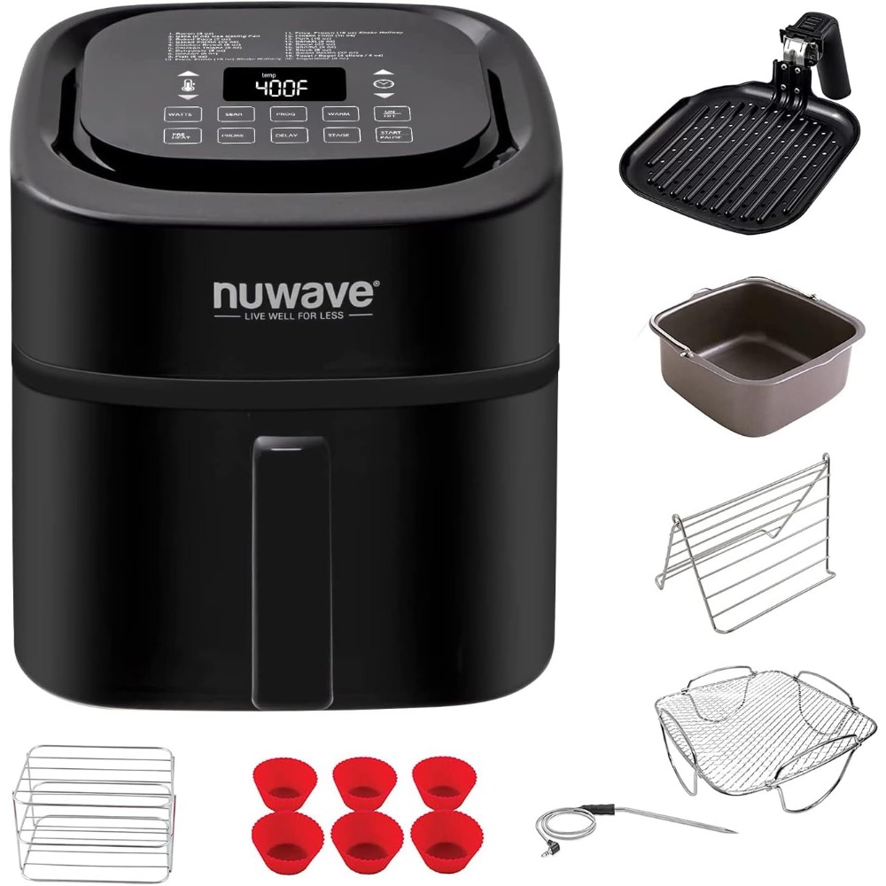 - ADVANCED FEATURES – The Nuwave Brio has a vast temperature range between 50°F and 400°F, adjustable in 5°F increments with the simple press of a button. It features Reheat and Preheat buttons as well as a selection of 100 recipes preprogrammed into the unit for added convenience.
