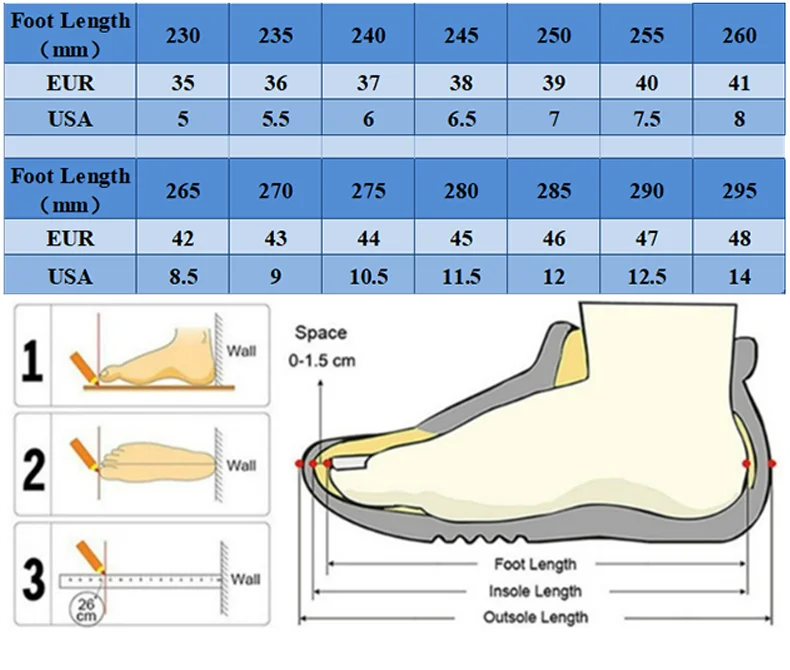 Choose the shoes size refer to your FOOT LENGTH.(Size Chart can help you solve 90% of size choosing problem.)