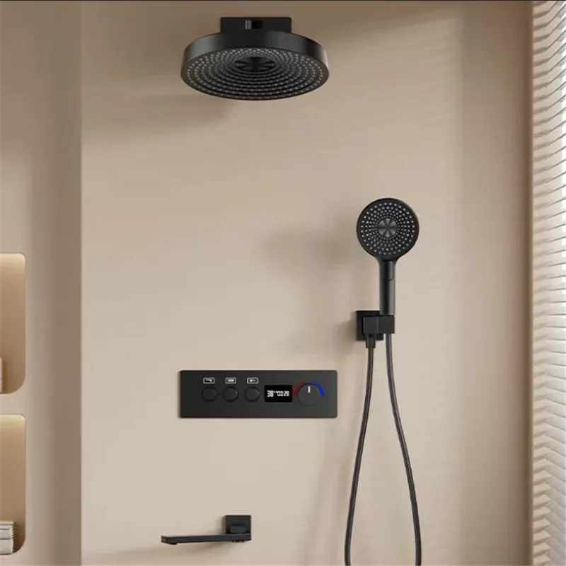 Brushed Gold Thermostatic Bathroom Shower Faucet in Wall Bath and Shower Faucet Set Thermostatic Mixer Bath and Rainfall Shower