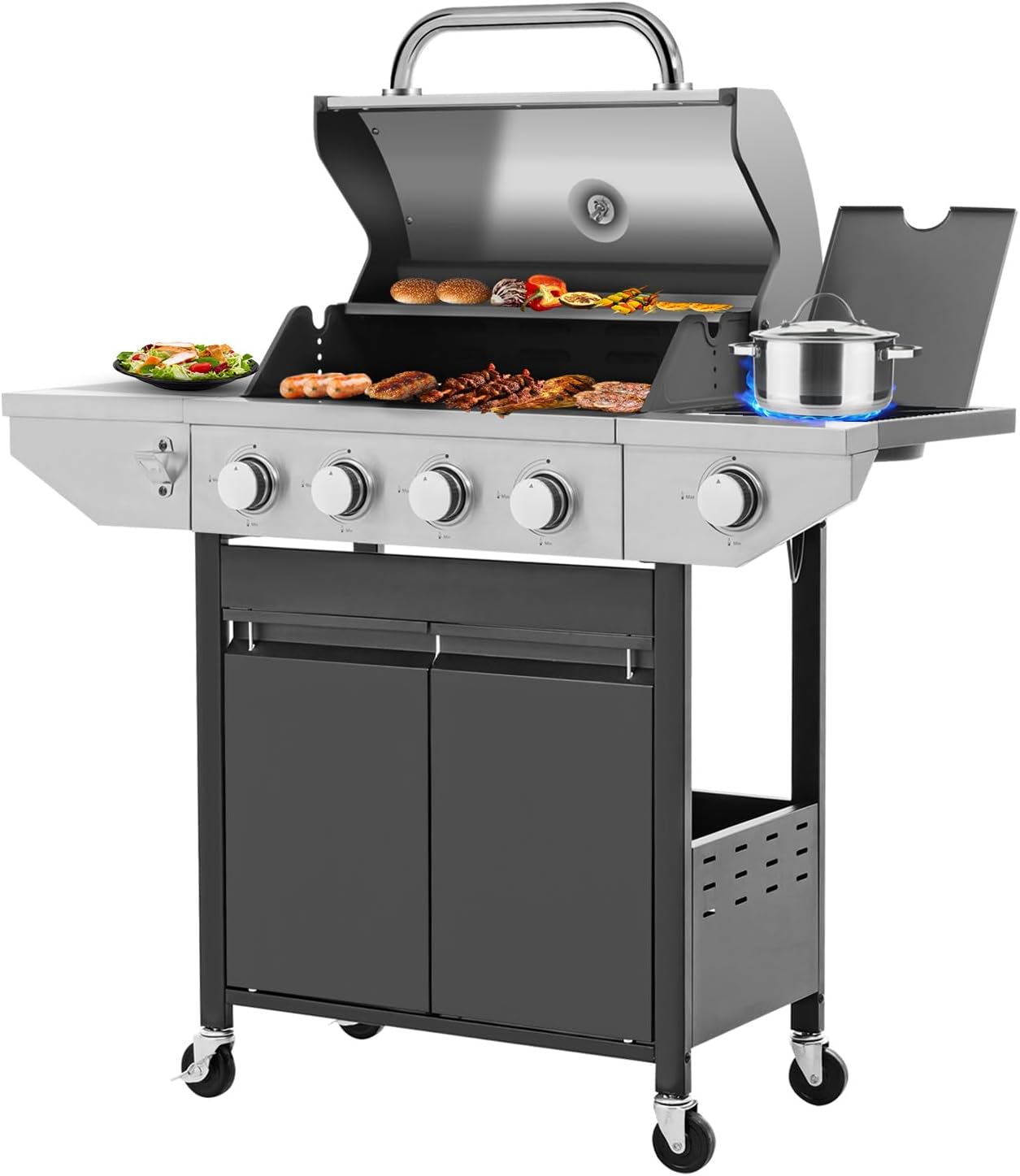 - 【More Burners, Better Control the Heat】 The large outdoor gas grill owns 3 main burners and 1 side burner, which can provide 4,7000 BTU. Main burners give a quick, high heat, which is great for searing steaks. Side burners are used like any stovetop burner, perfect for pots and pans. Each burner is a promise to your health, allowing for the most precise temperature management and portion sizes.