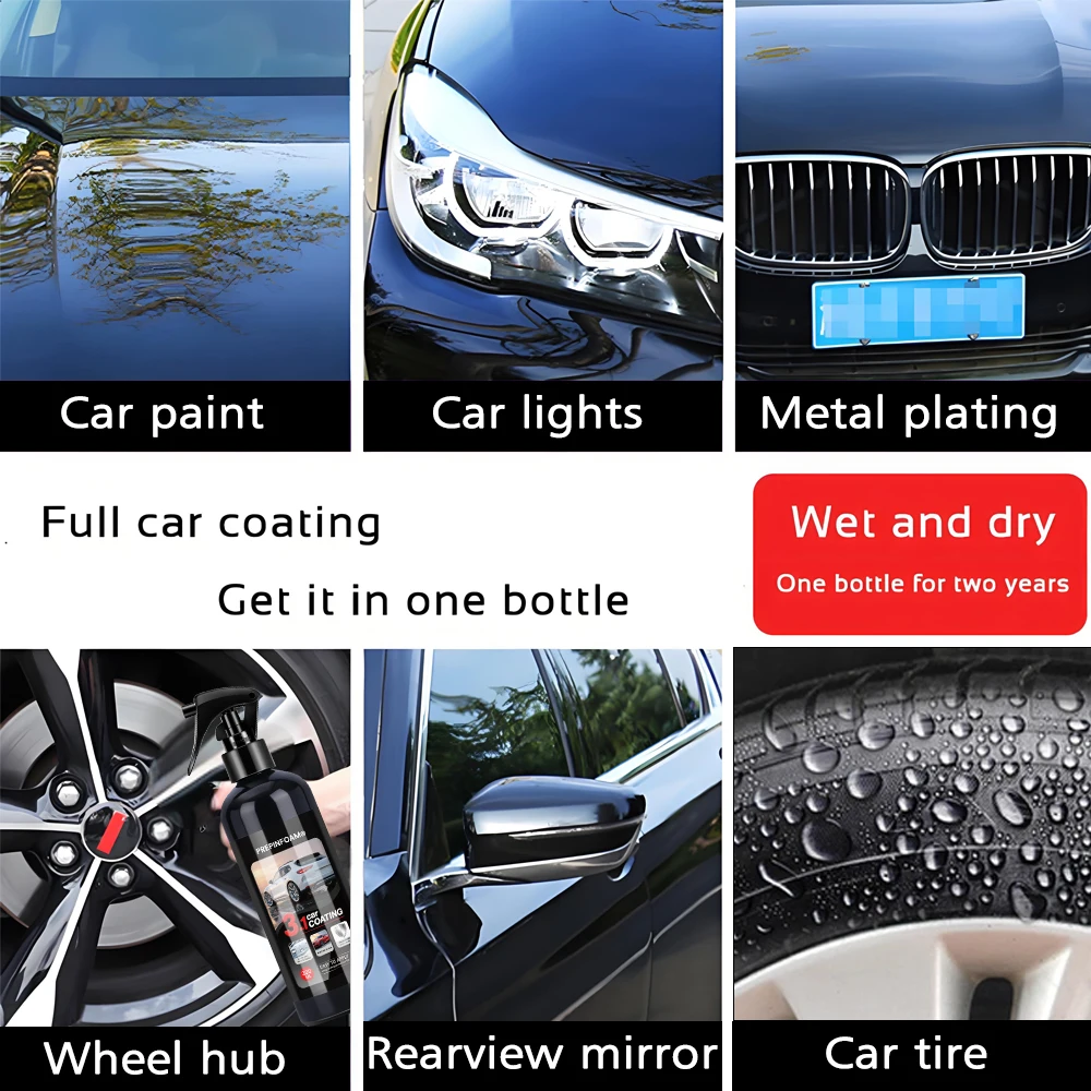 Functionality :The product offers a 3-in-1 solution, combining ceramic coating, nano super hydrophobic protection, and polishing spraying, all in one product. The spray can be used on the full car, including paint/glass/tires/wheels, etc. You can directly use this product to clean your car, and has a strong hydrophobic effect.