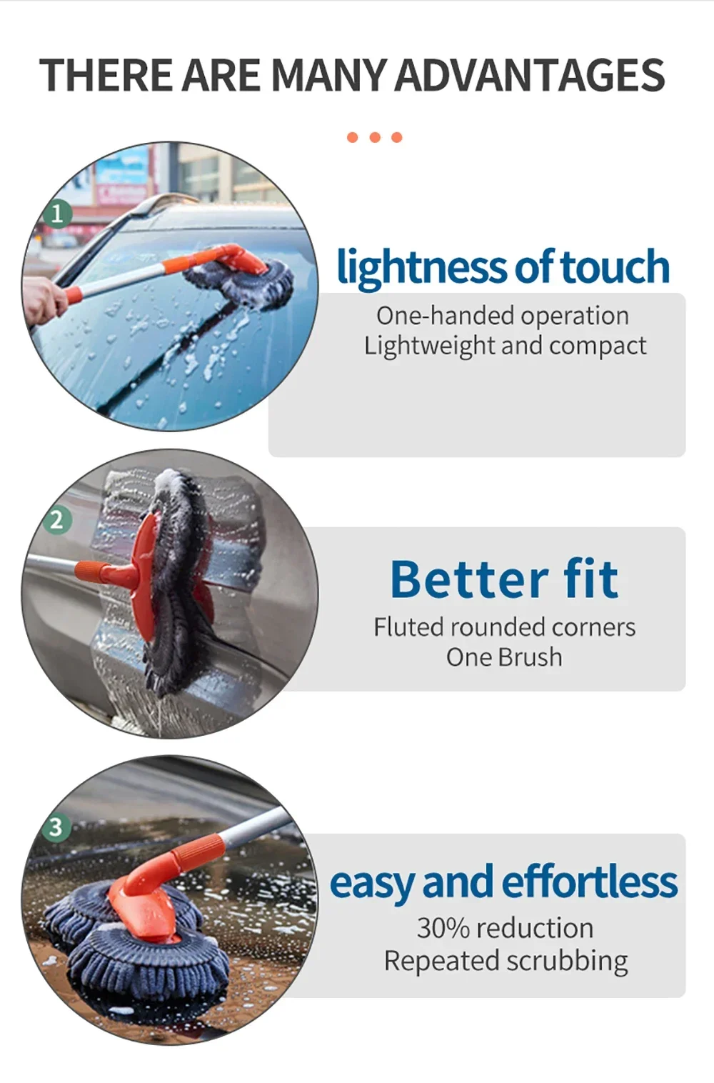 1,Flexible Car Wash Brush: 90° adjustable brush handle for car wash without restriction. The 15-degree curved design reduces the possibility of accidental scratches.