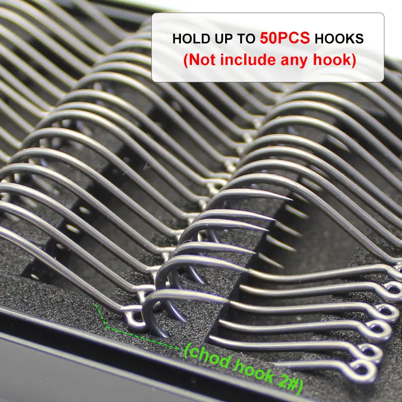 1. It can hold up to 50 individual CARP hooks in sizes from 2 to 8—such as curve shank hook ,Chod Hook ,wide gape hook.The slotted EVA insert is designed to hold each individual hook securely in place.