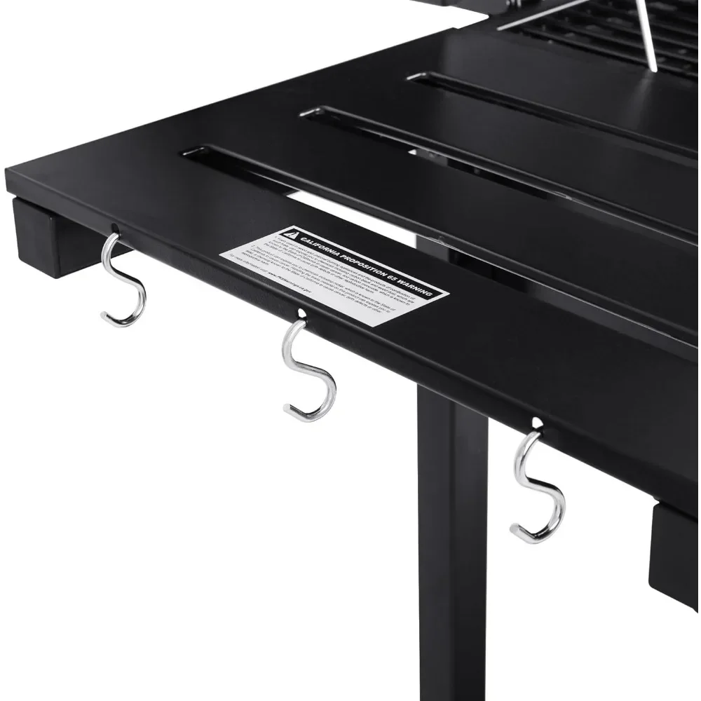 - Ample Storage: Collapsible side tables offer ample workspace and easy storage after use. Integrated “S” hooks and large bottom shelf keep your multiple grill accessories within arms’ reach.