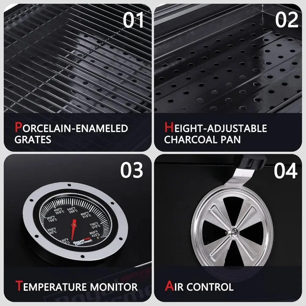 - Spacious Cooking Space: 498 sq. in. porcelain-enameled steel wire cooking grates and 221 sq. in. chrome-plated steel wire warming rack give a total of 719 square inches cooking area. Extra large cooking surface caters for big parties or events.