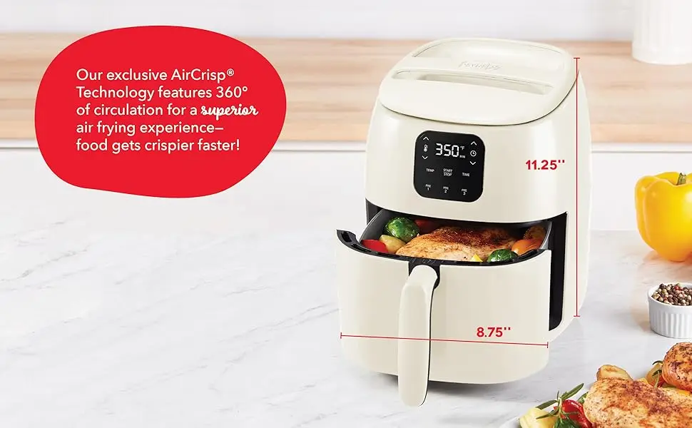 The convenient mini air fryer is sized for any kitchen, making storage easy without taking up too much room. The 2.6 qt. capacity and redesigned Crisper Basket allows for greater surface area, ensuring perfectly crisp food, every time.