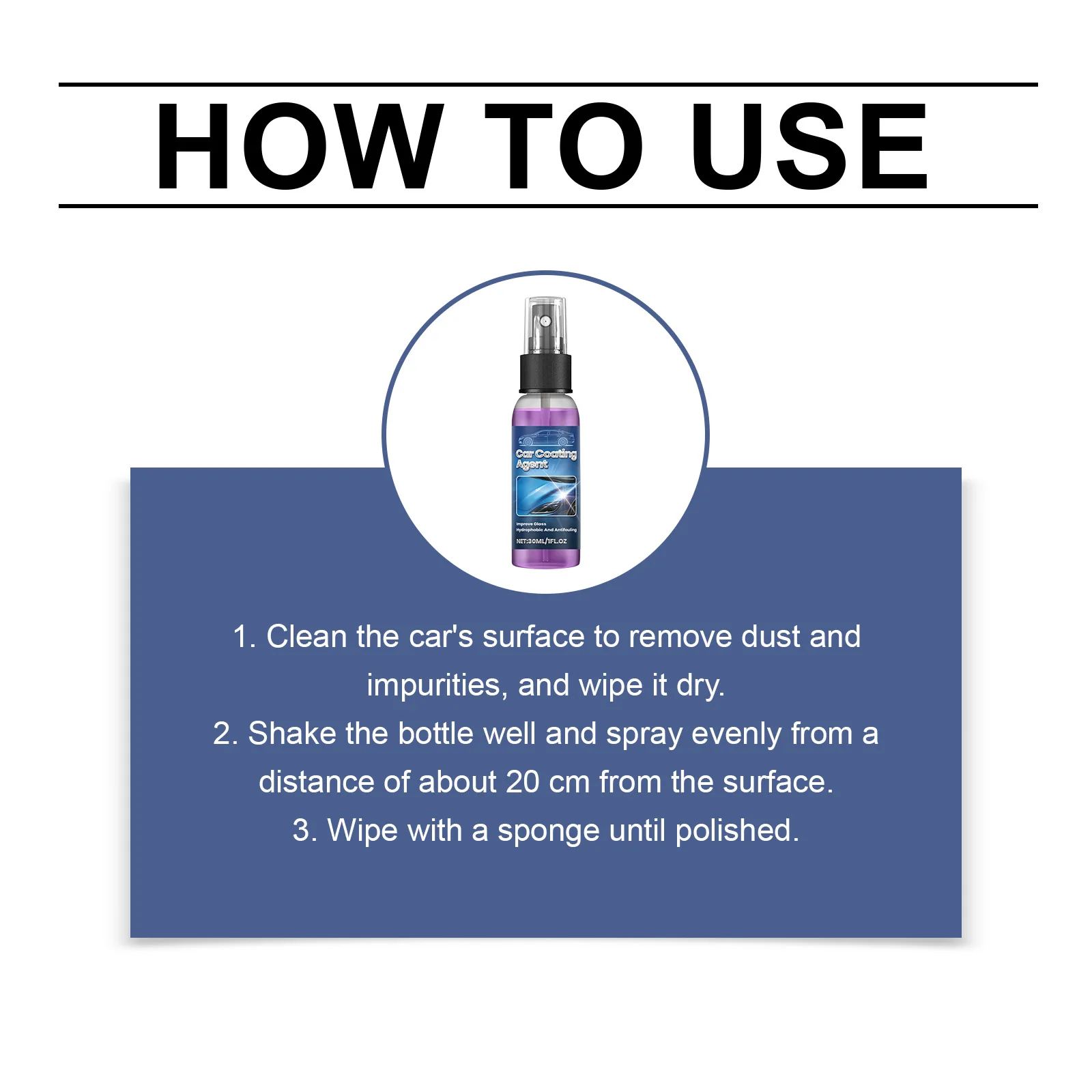 2、Application: Shake the bottle well. Apply 3-4 small drops of product onto a high-quality foam applicator pad. Spread a very thin, even layer onto one panel (e.g., hood, roof) using straight-line or cross-hatch motions. The product should be nearly transparent.