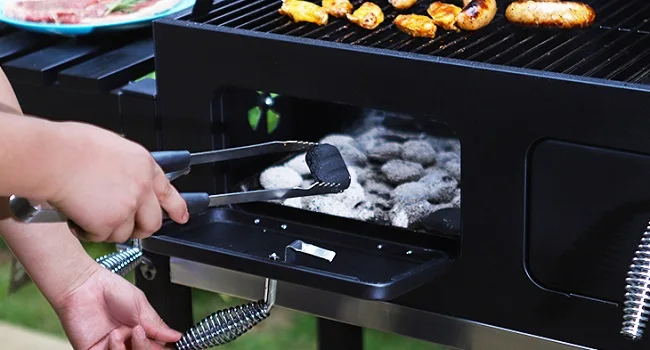 Charcoal access door with cool-touch handles not only improves safety but also makes grilling with charcoal more convenient and efficient