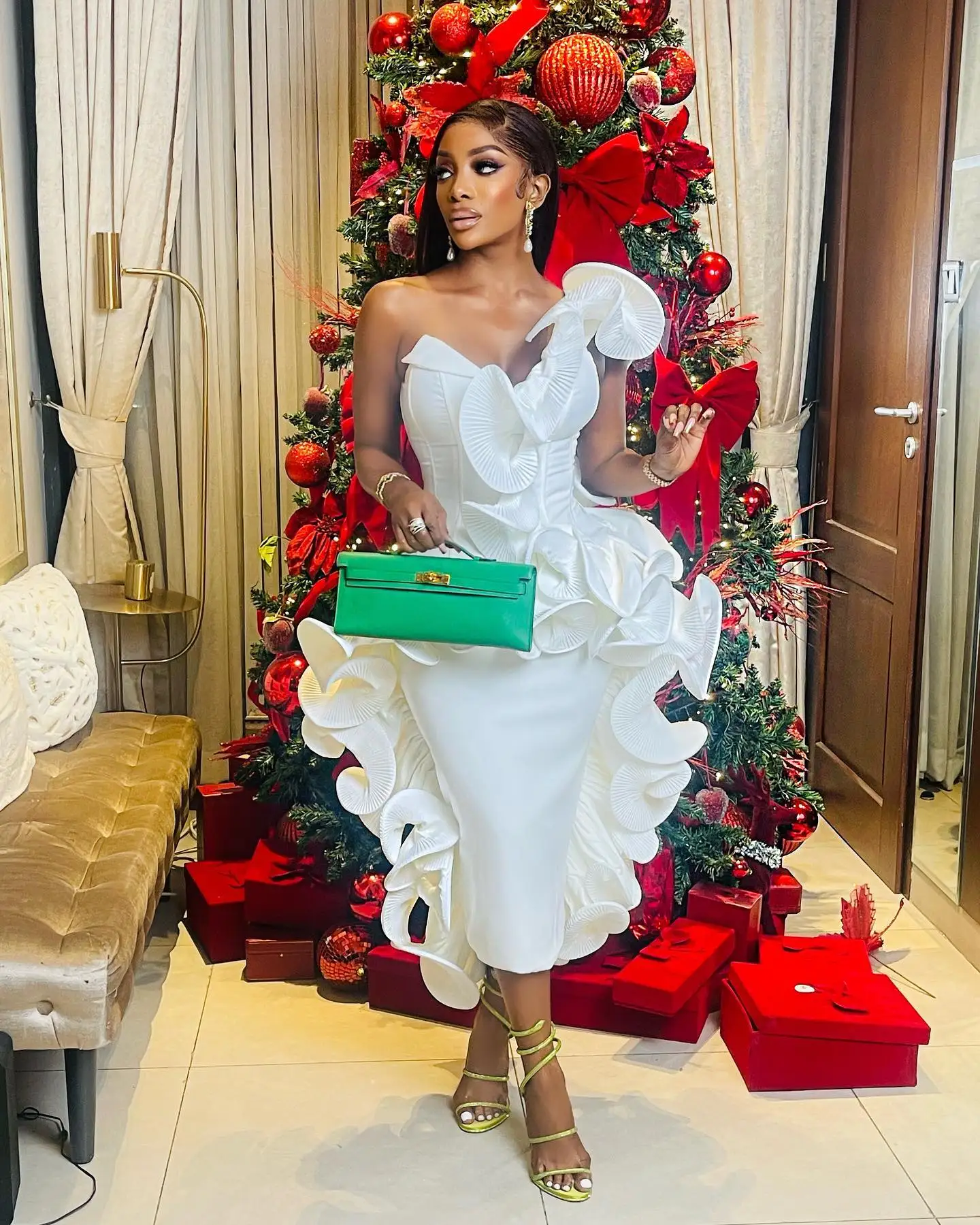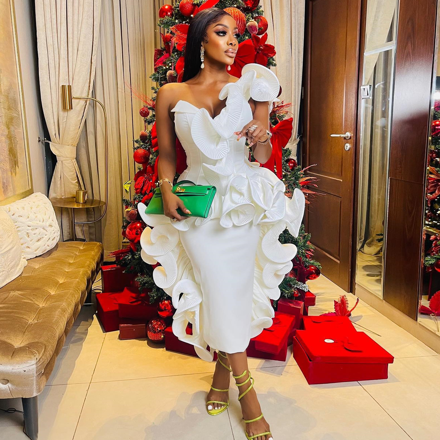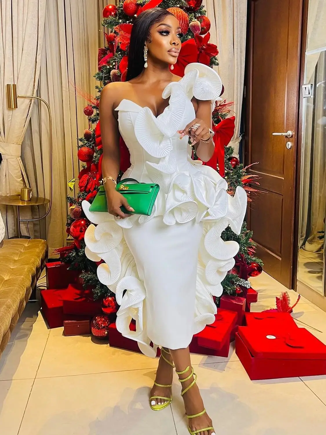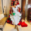 Chic African White Ruffle Prom Dresses 2024 Designer One Shoulder Tea Length Cocktail Party Dress Black Women Ruched Formal Gown