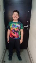 Received quickly. The t-shirt is very beautiful with very bright colors. Size normally. My son is very happy