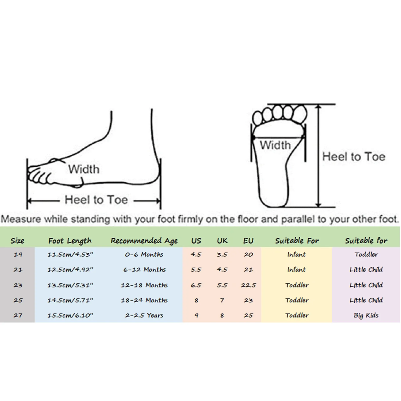 | Size:27 | Foot Length:15.5cm/6.10” | Recommended Age:2-2.5 Years | US:9 | UK:8 | EU:25 | Suitable For:Toddler |