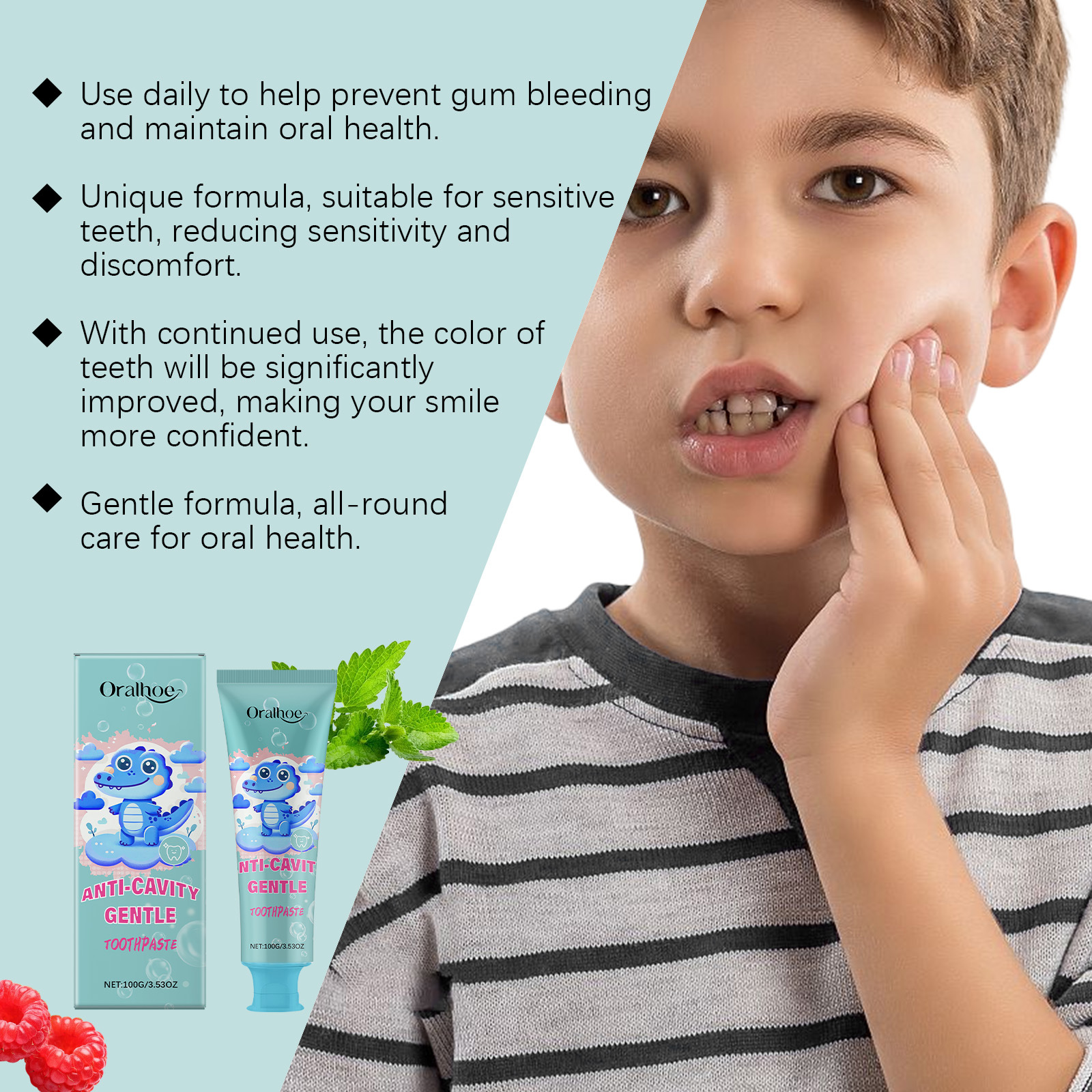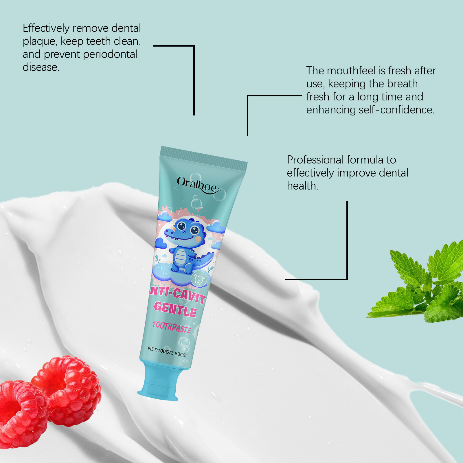 4. Fresh breath, remove unpleasant odors from the mouth, paired with cute packaging design, attract children to brush their teeth actively, and cultivate long-term oral care habits.