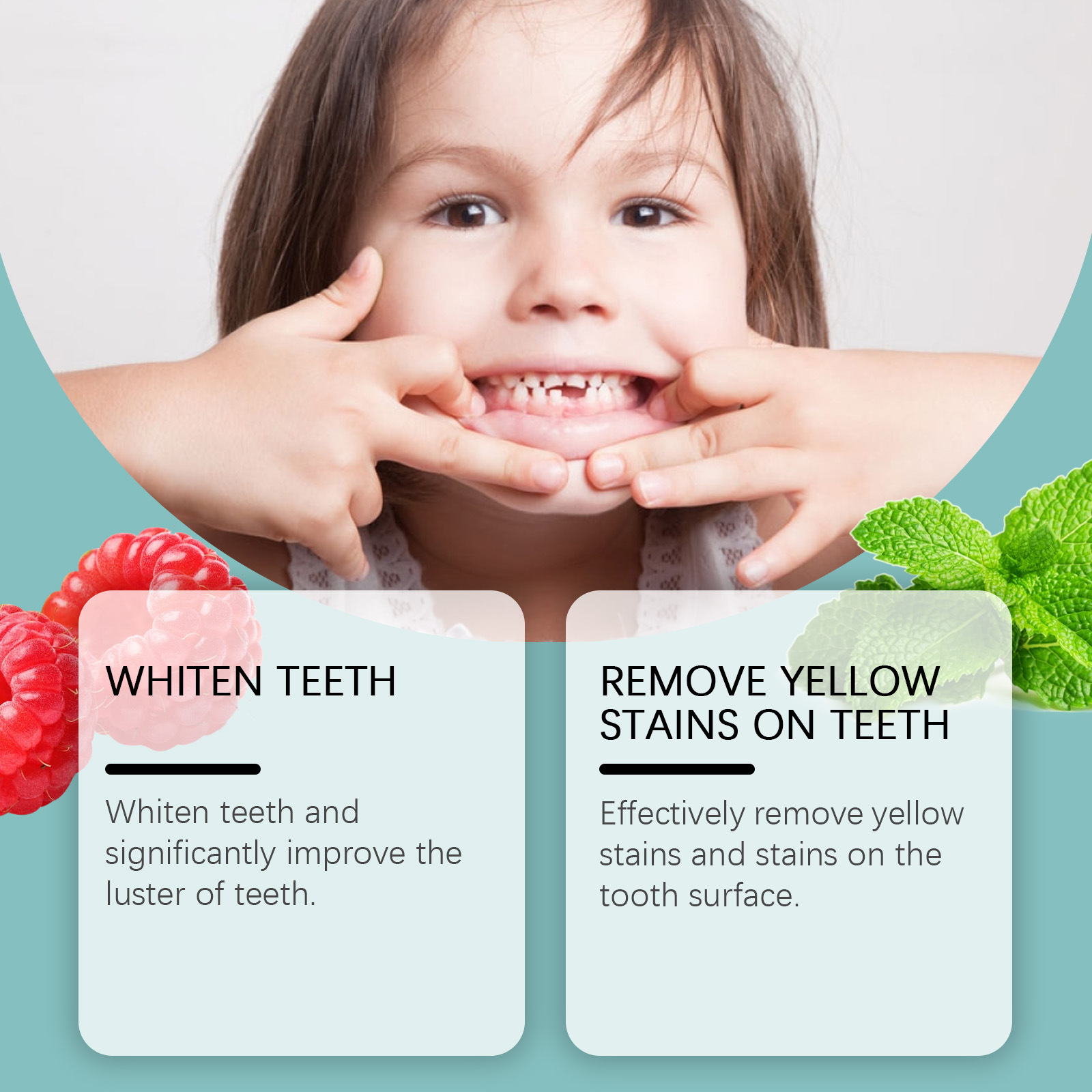 1. Prevent tooth decay, remove yellow stains on teeth, protect children’s teeth, resist food residue and bacterial erosion, reduce the risk of tooth decay, and make baby’s teeth stronger and healthier.