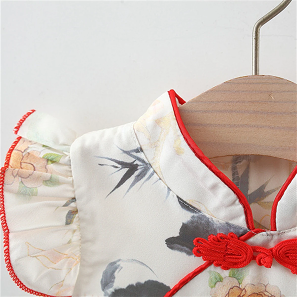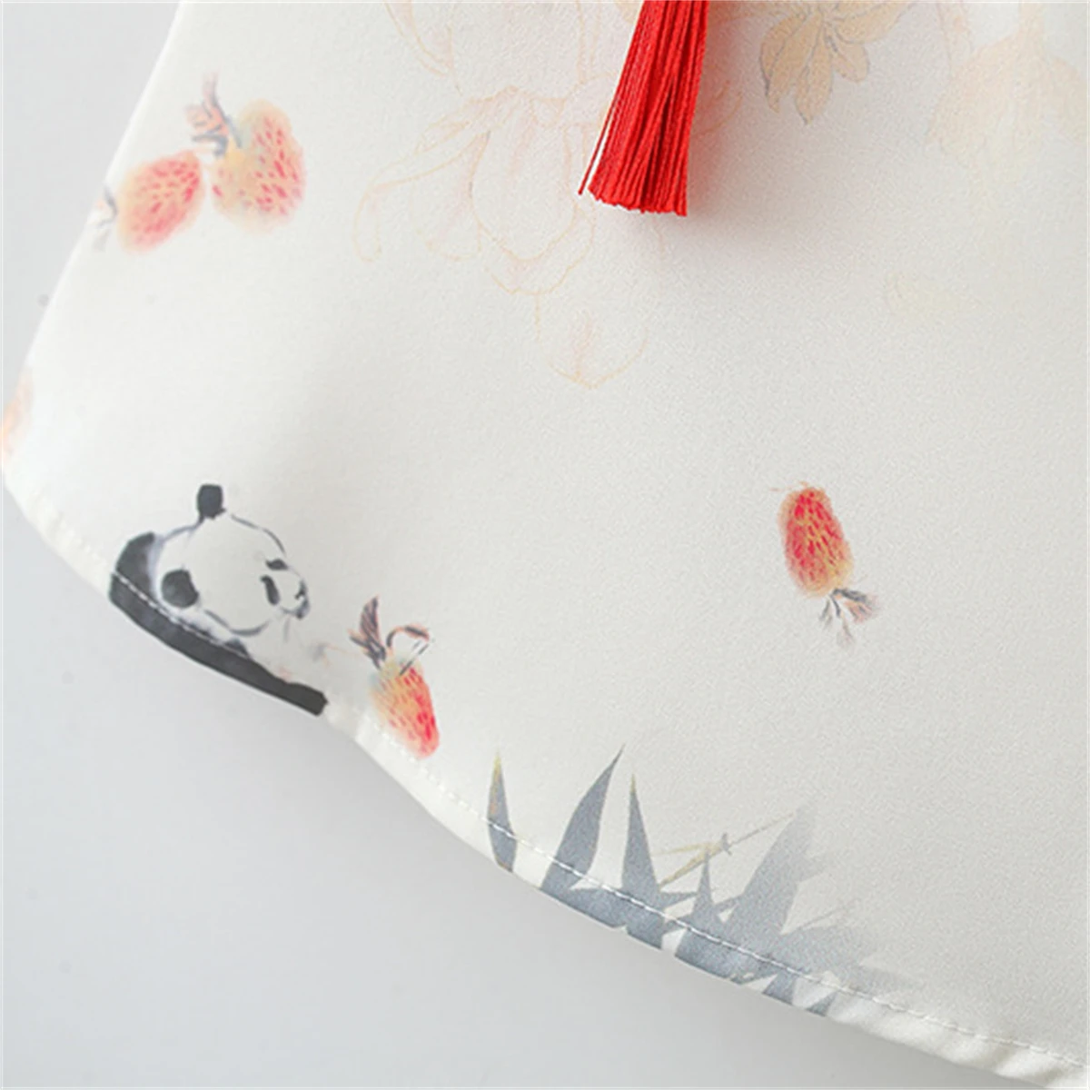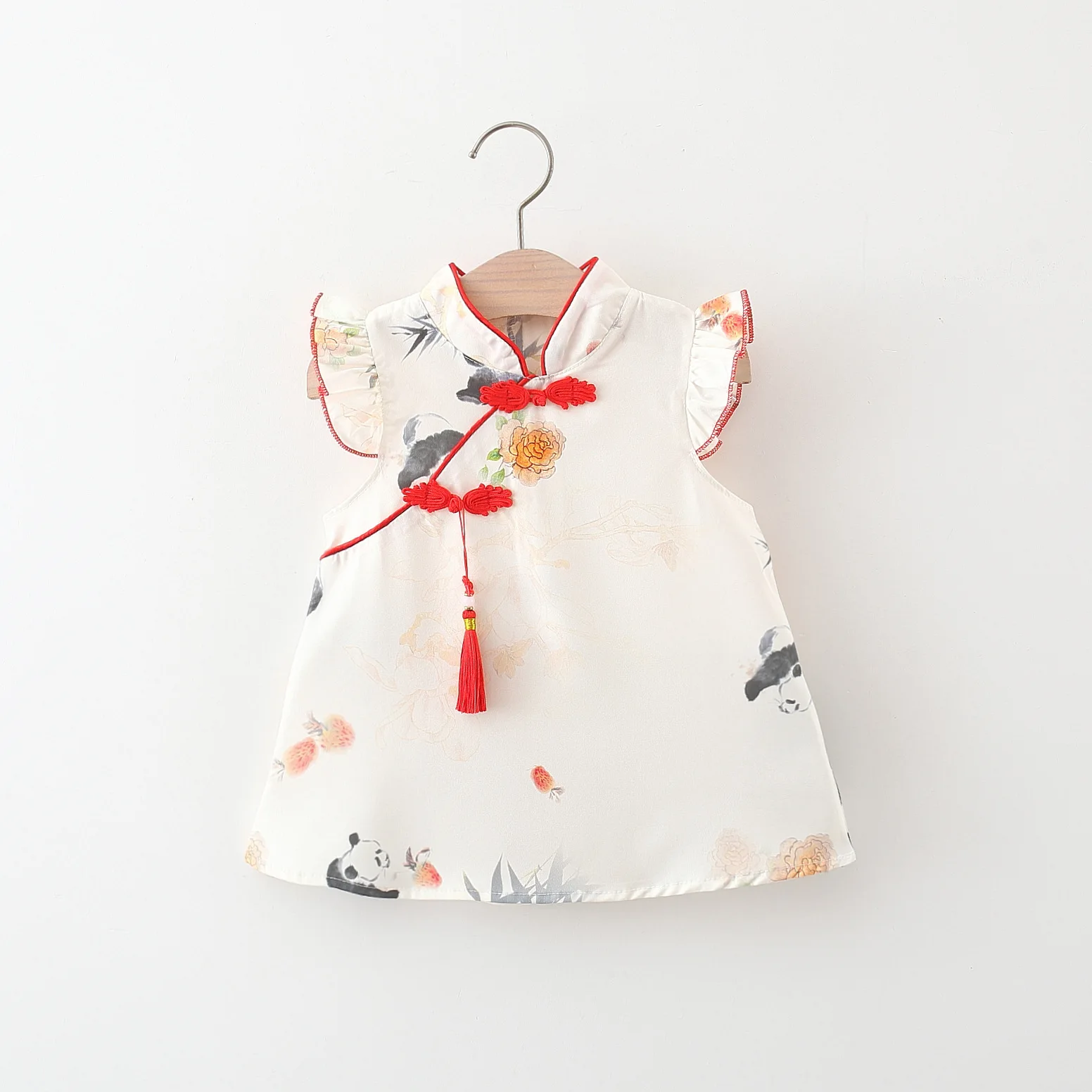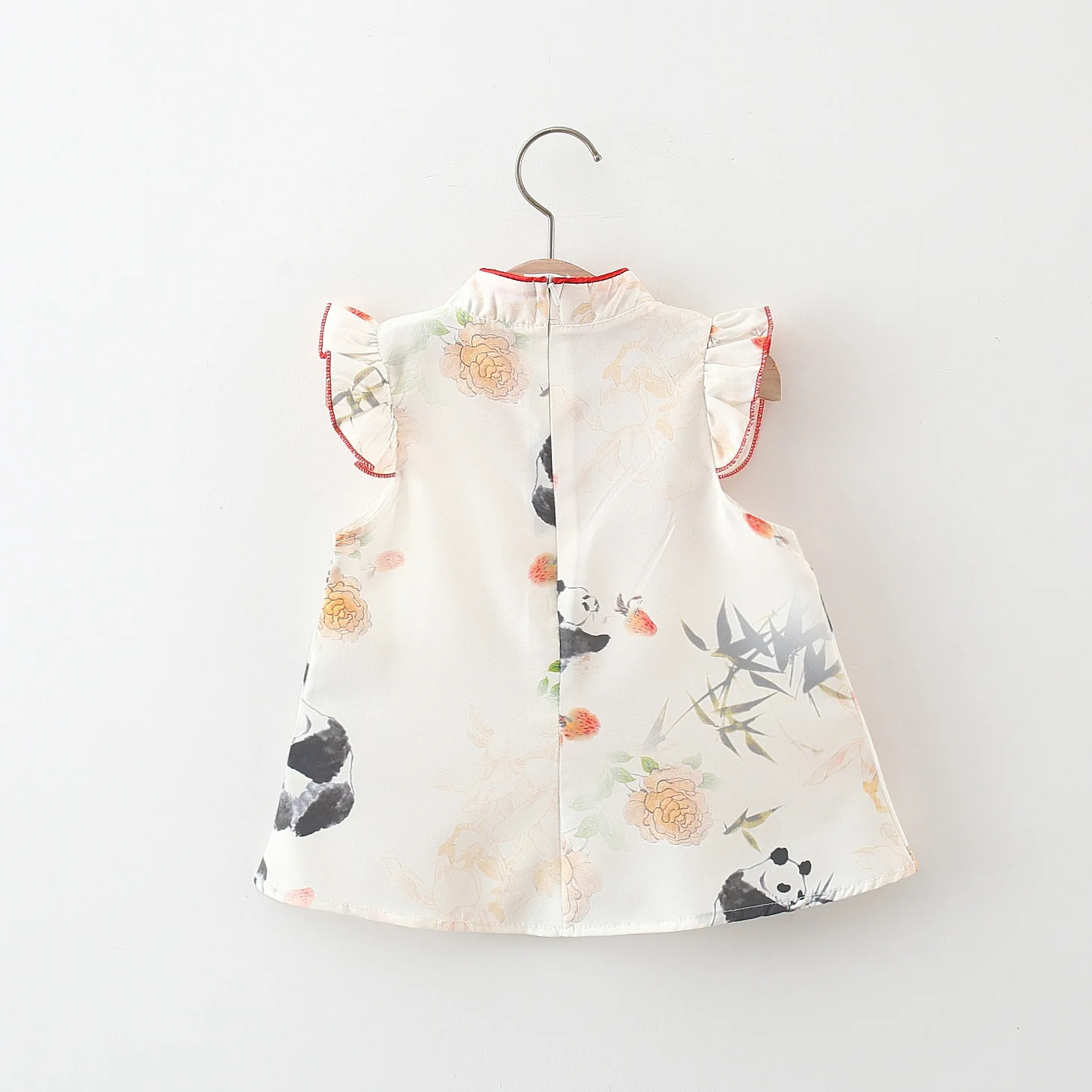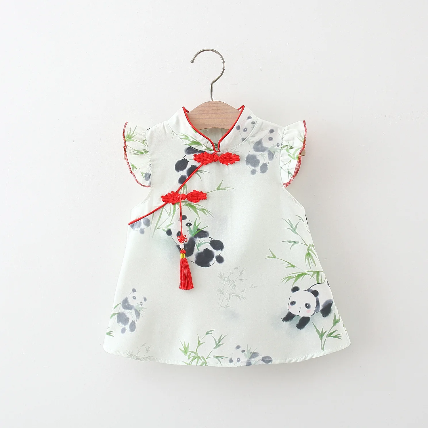Chinese style girls’ dress summer baby girl cartoon panda bamboo print small flying sleeves buckle tassel cheongsam dress