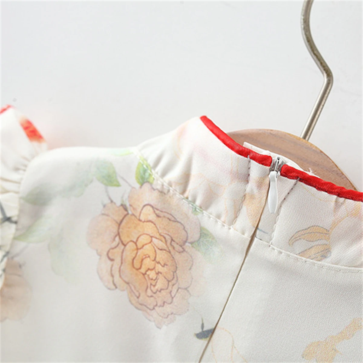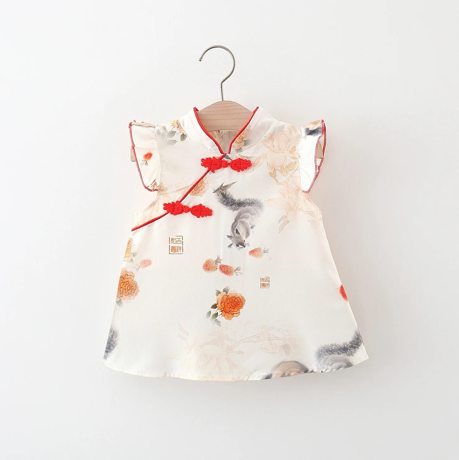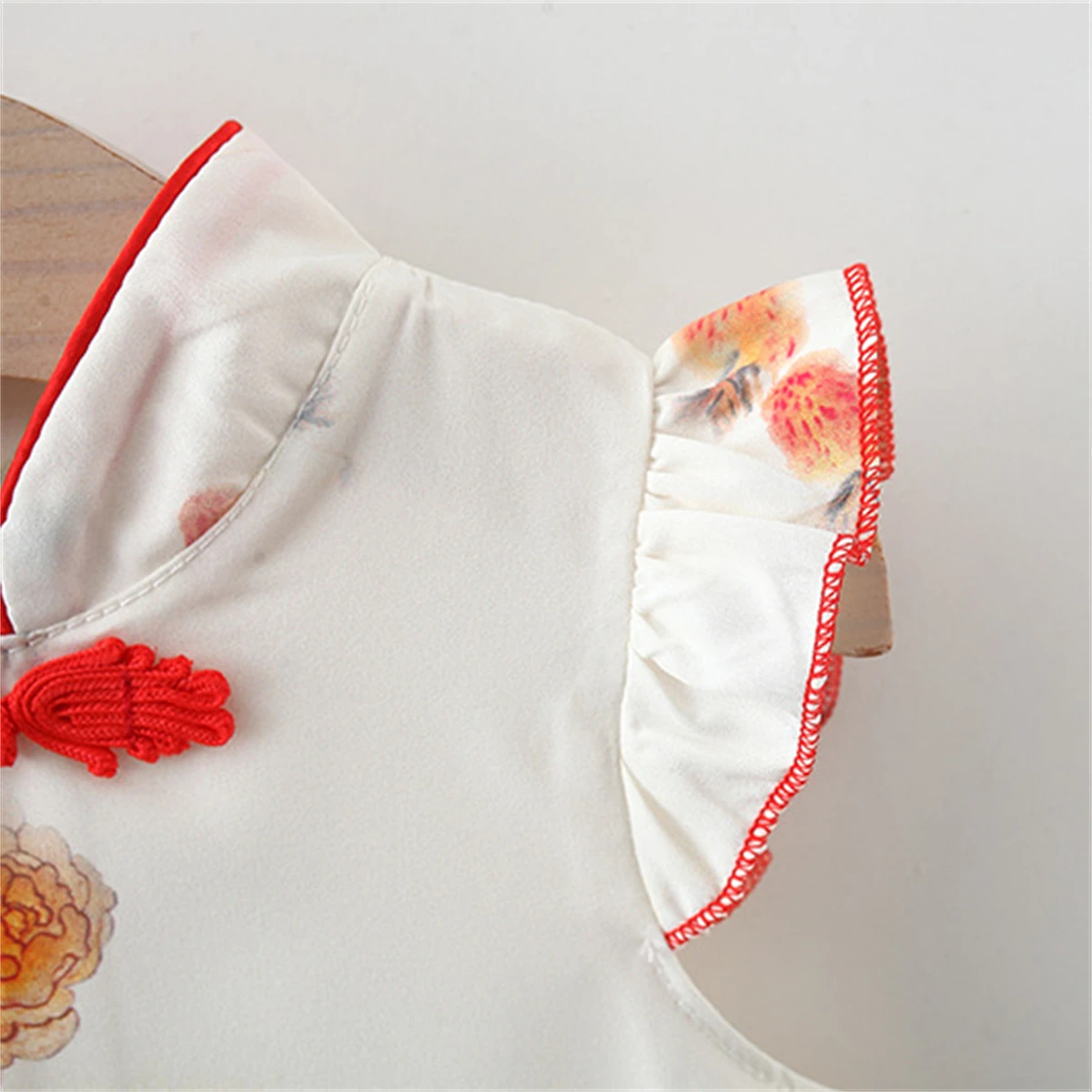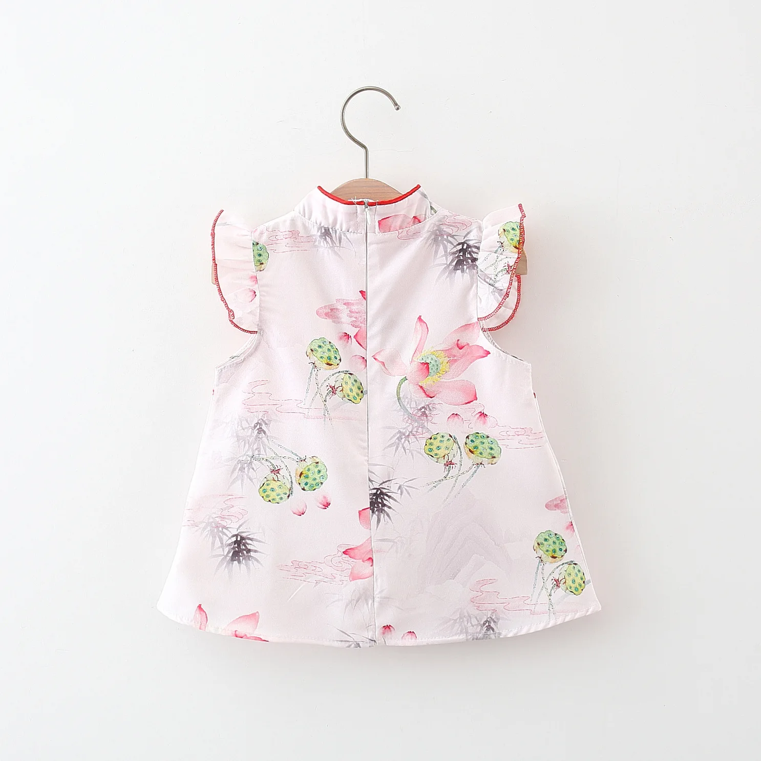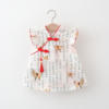 Chinese style girls’ dress summer baby girl cartoon panda bamboo print small flying sleeves buckle tassel cheongsam dress