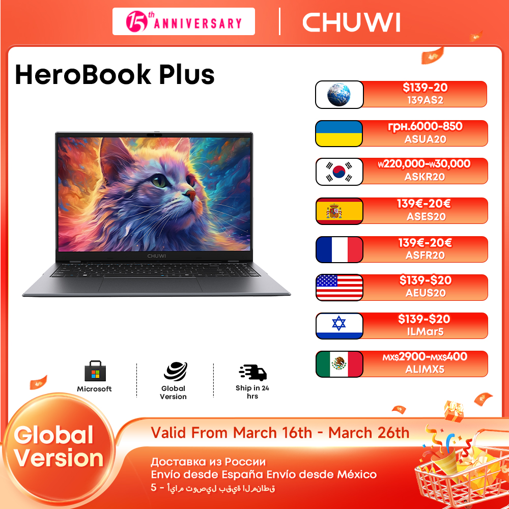 – CHUWI HeroBook Plus laptop is equipped with a 14.1-inch FHD IPS screen, 1920x1080p.