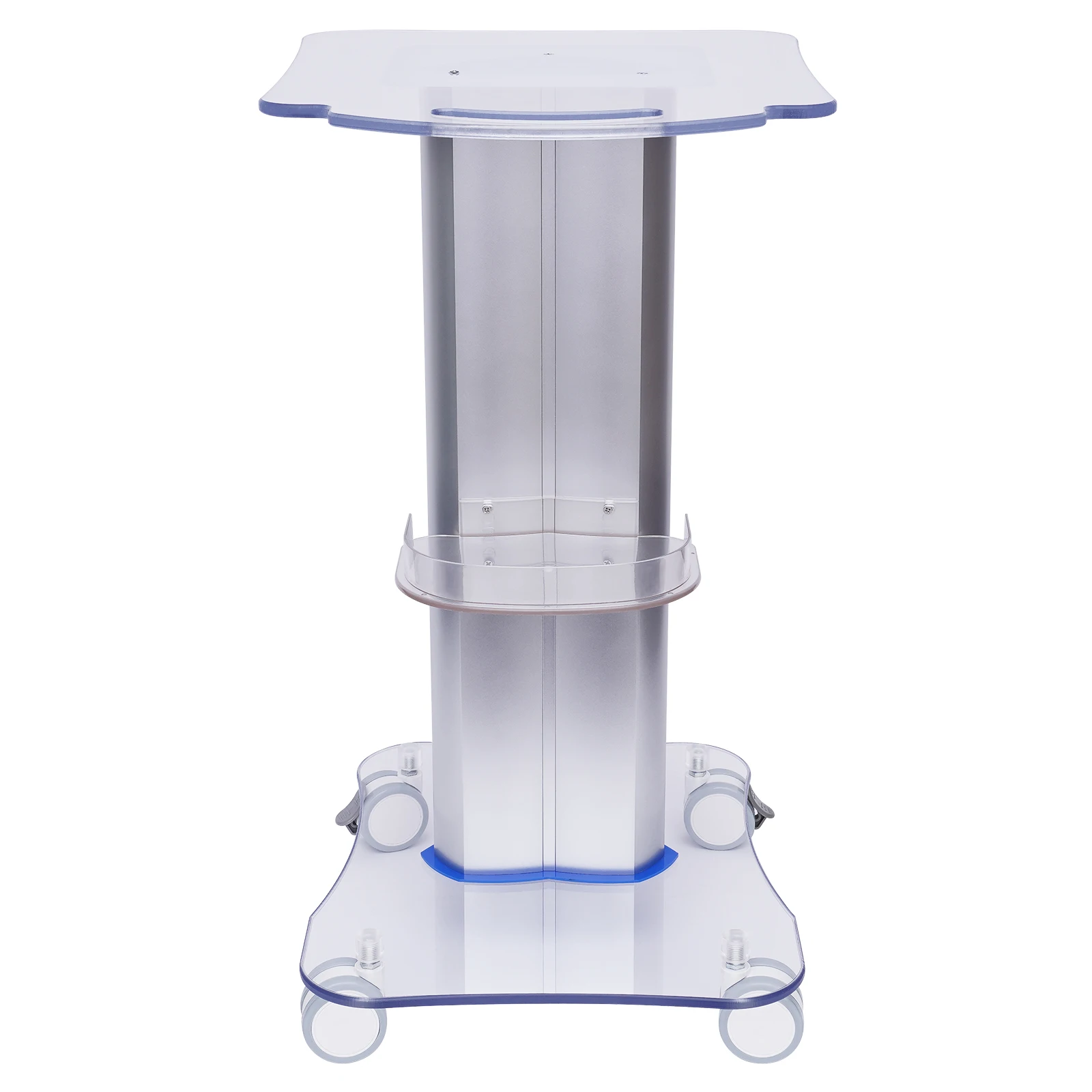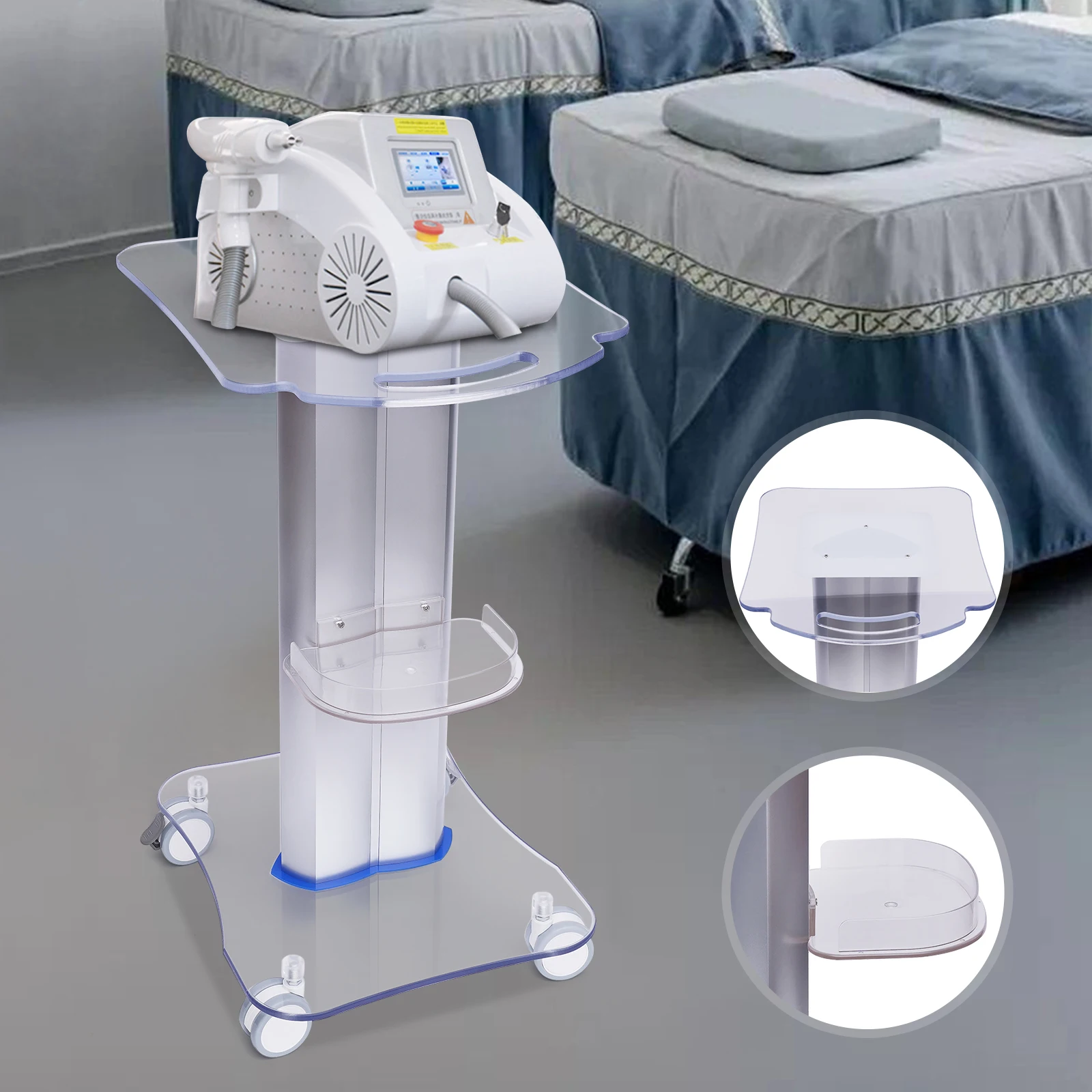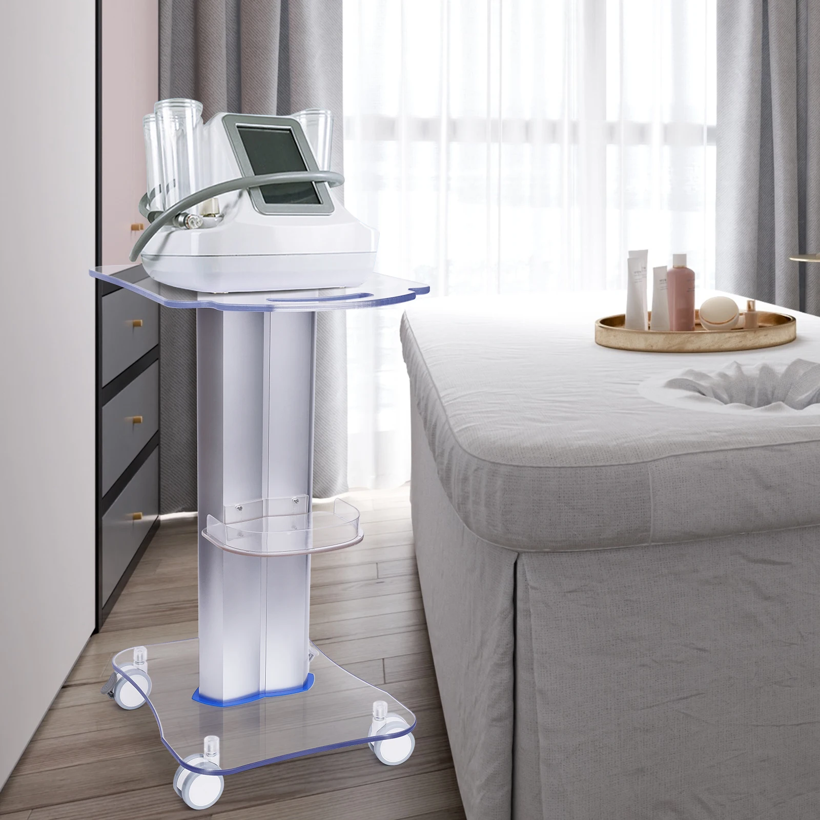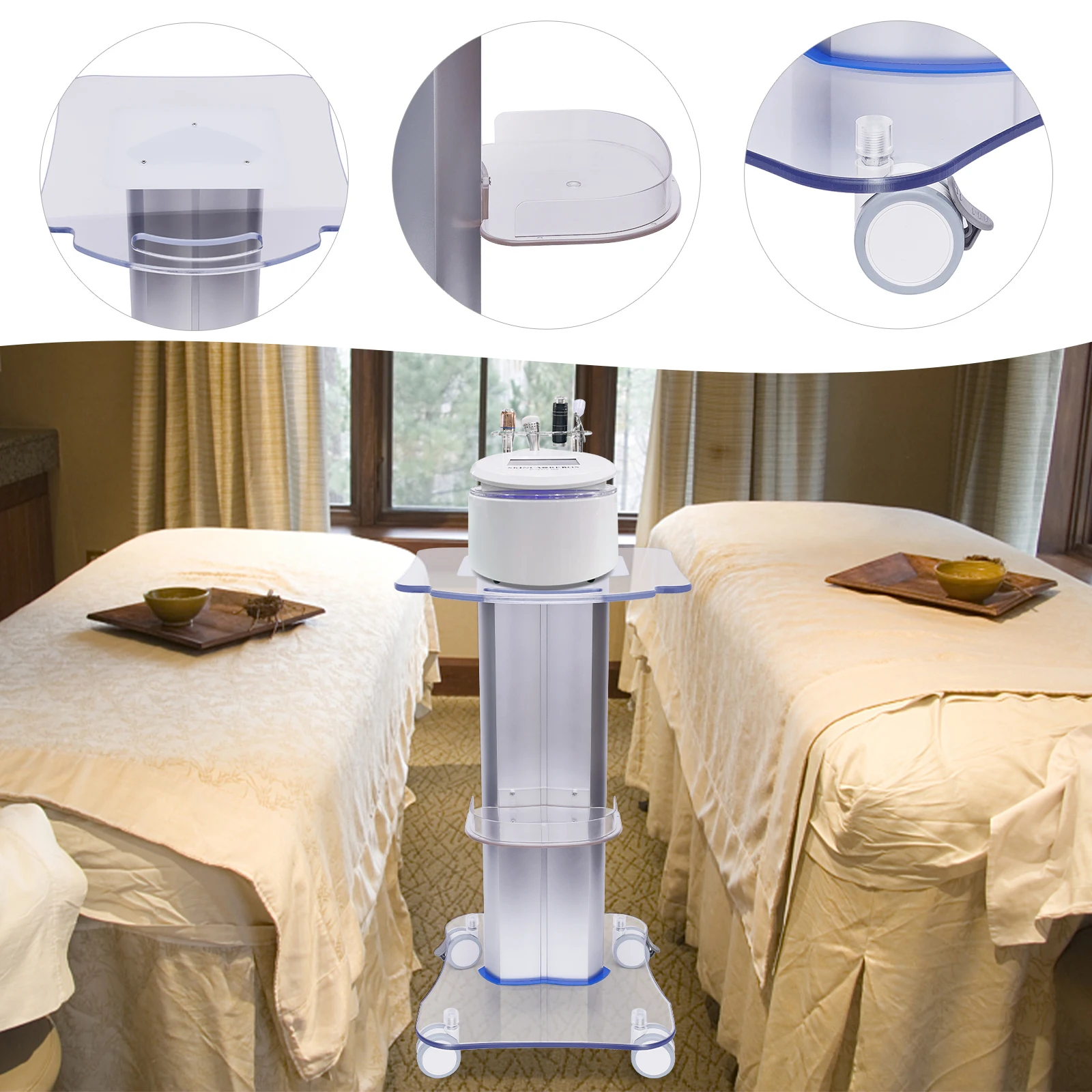 The improvement of the level of beauty instruments is not only by the internal settings but also by the external configuration of the products. Therefore, a high-end trolley with a sense of design is needed. Our salon trolley is made of high-quality acrylic and PVC, which is both beautiful and durable. The universal wheel at the bottom is low noise and easy to move.