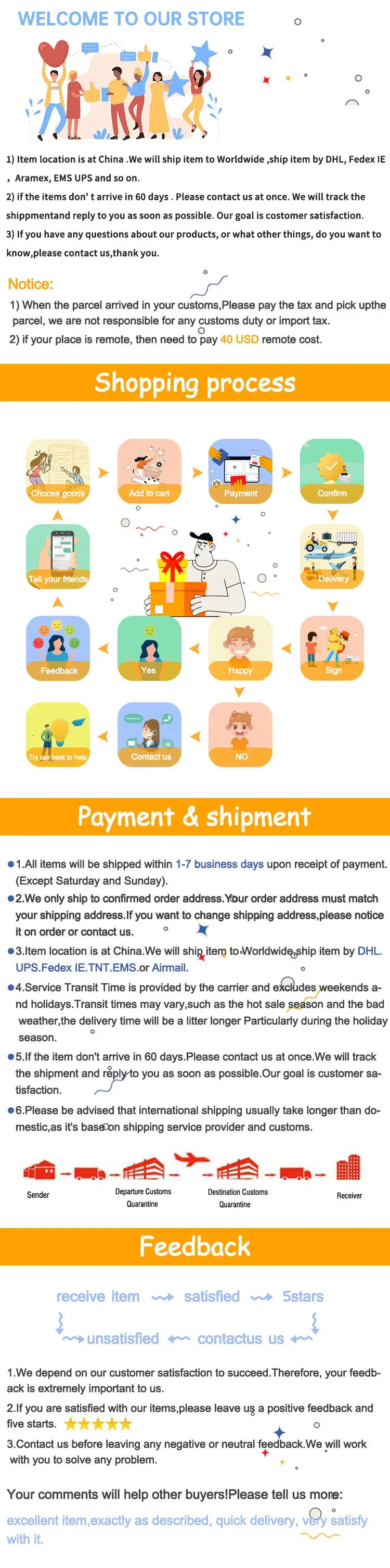 6. When the package arrives at the customs of your country, you need to pay taxes and pick up the package. We are not responsible for paying customs duties or import taxes! If you are in a remote area, you need to pay an additional $40 for remote areas!