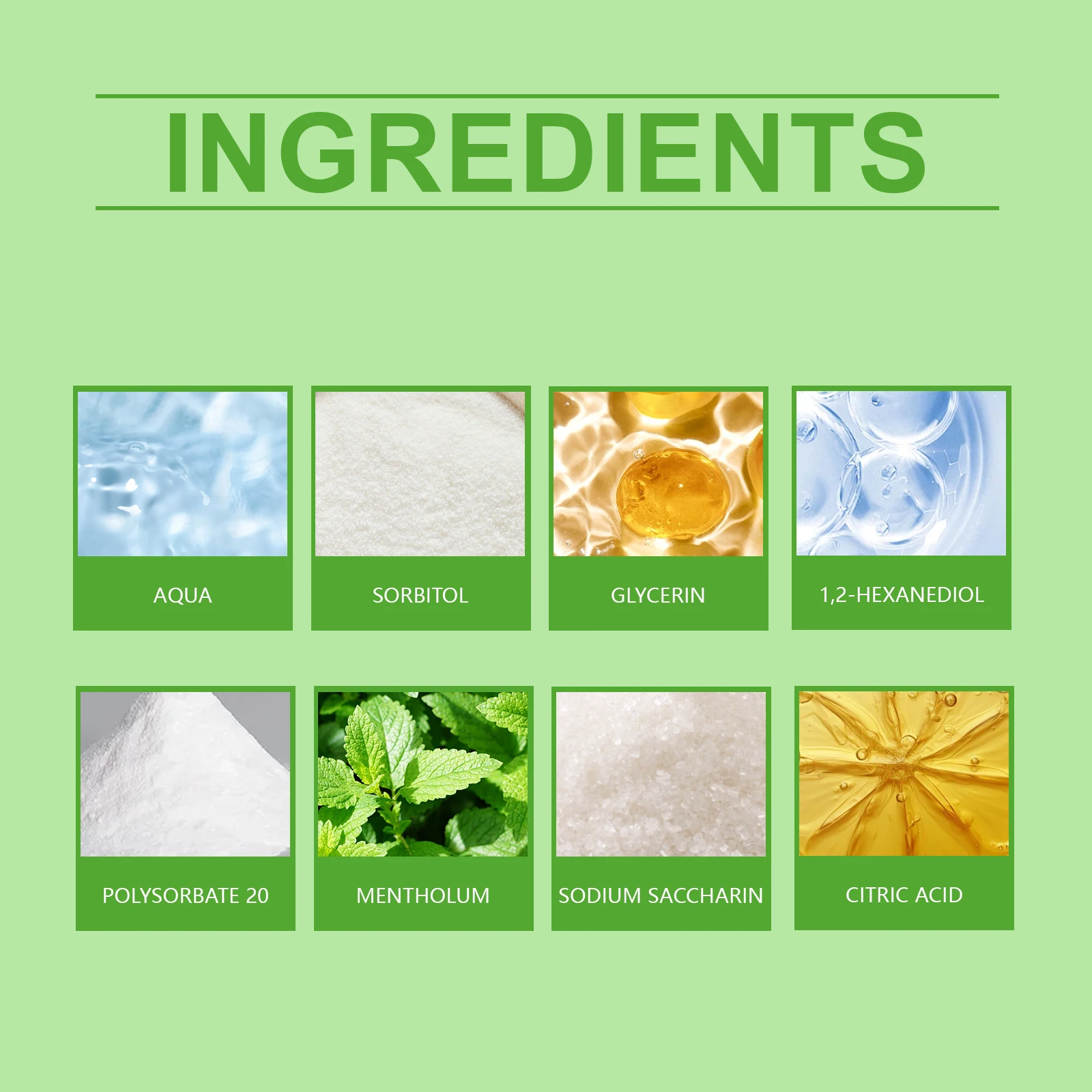 Ingredients: Water, sorbitol, glycerin, 1,2-hexanediol, polysorbate-20, menthol, sodium saccharin, citric acid