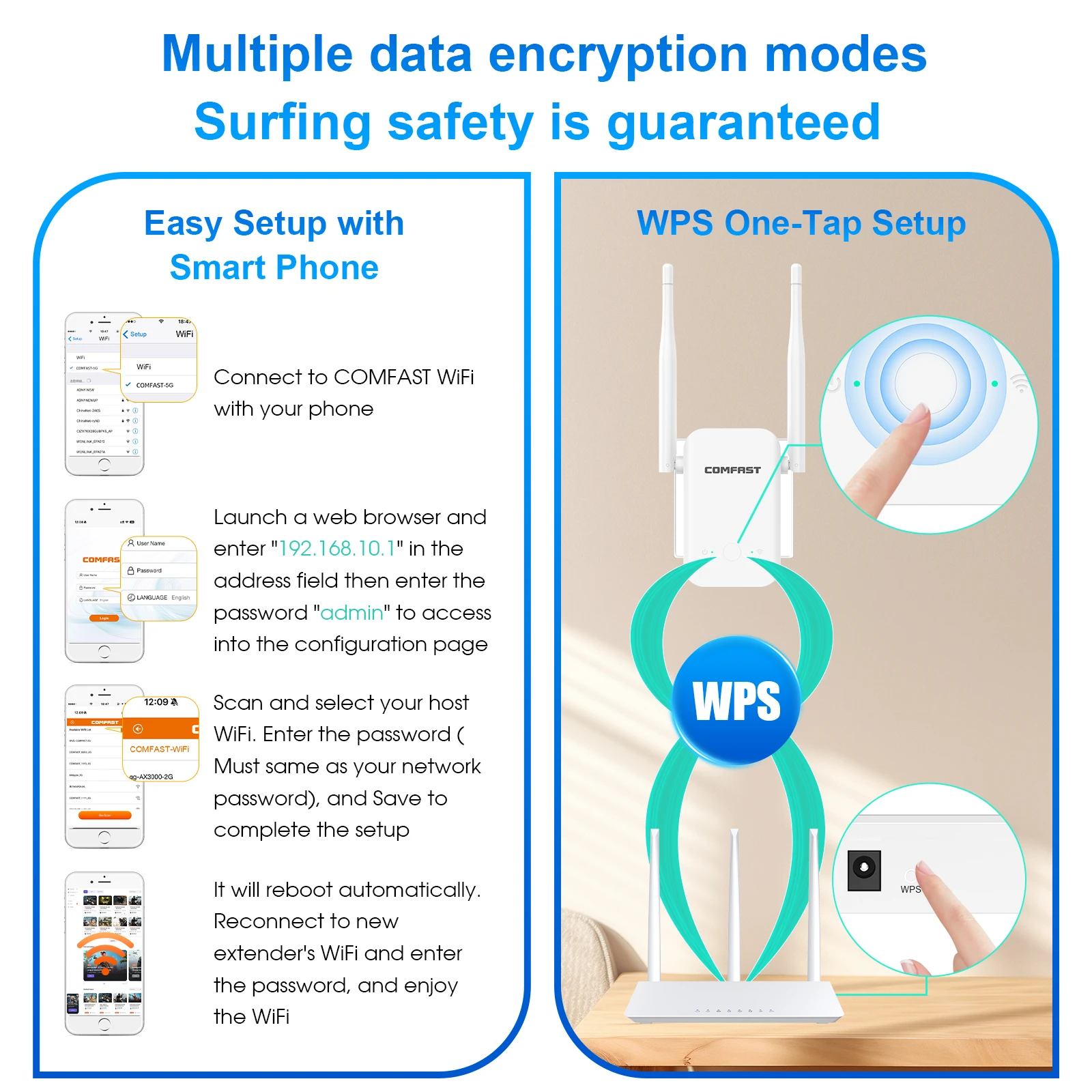 Effortlessly extend your WiFi coverage with the WPS one-touch pairing feature. Simply press the WPS button on your main router and then on the COMFAST extender—it automatically connects and expands your network within seconds, without needing a password.