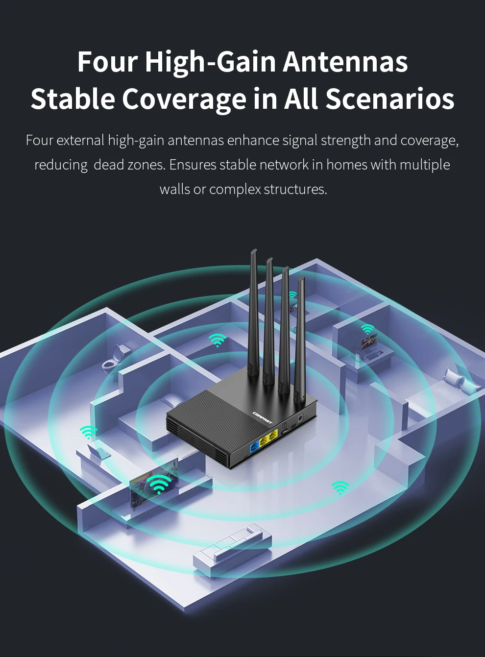 Four external high-gain antennas enhance signal strength and coverage, reducing dead zones. Ensures stable network in homes with multiple