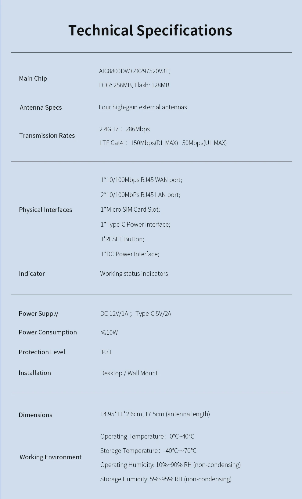 4G LTE Cat.4 Technology supports up to 150Mbps download speed , meeting the network needs of all scenarios such as home, office, and outdoor, and flexiblyresponding to diverse network challenges.