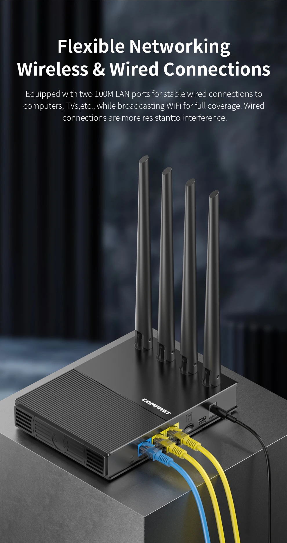 Equipped with two 100M LAN ports for stable wired connections to computers, TVs,etc., while broadcasting WiFi for full coverage.Wired