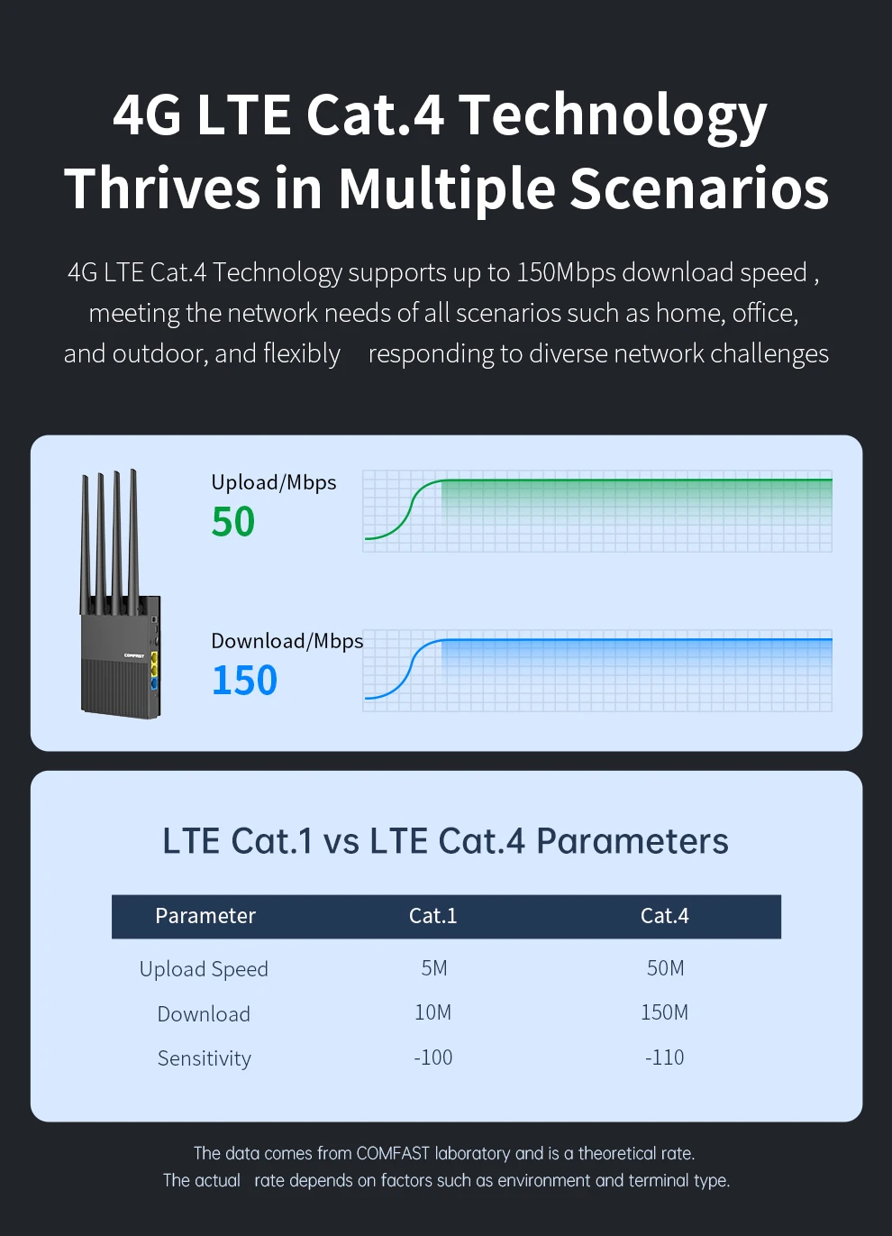 4G LTE Cat.4 Technology supports up to 150Mbps download speed , meeting the network needs of all scenarios such as home, office, and outdoor, and flexiblyresponding to diverse network challenges.