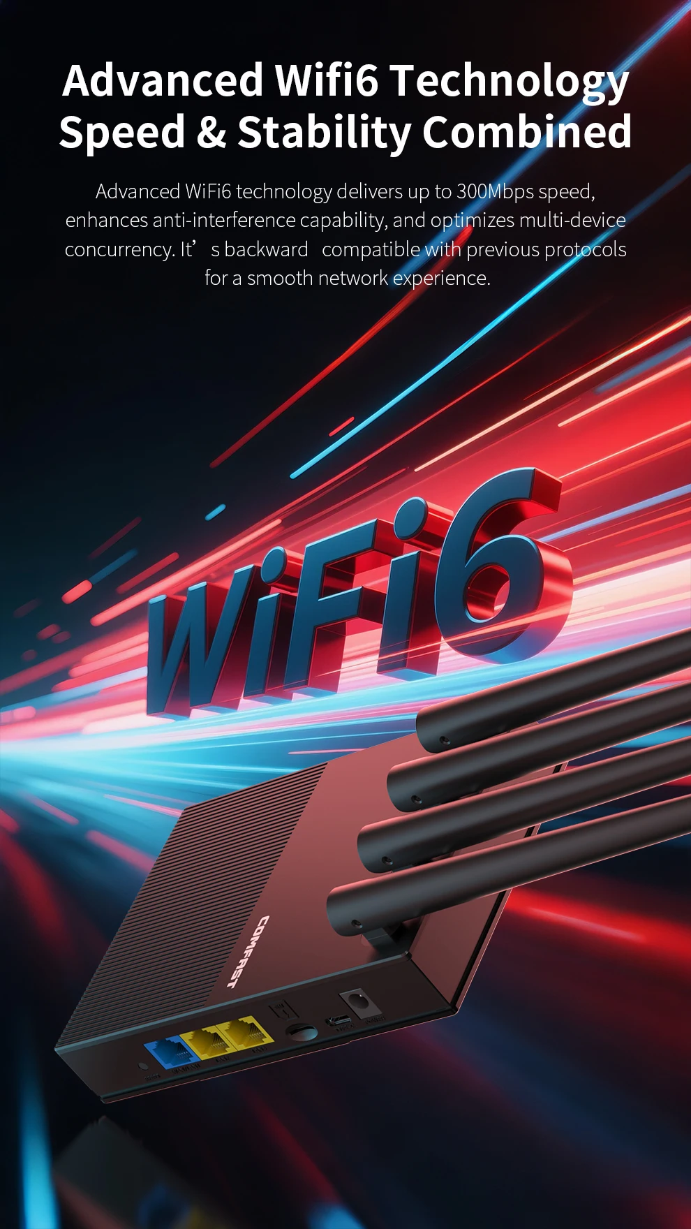 Advanced WiFi6 technology delivers up to 300Mbps speed, enhances anti-interference capability, and optimizes multi-device concurrency. It’s backward compatible with previous protocols