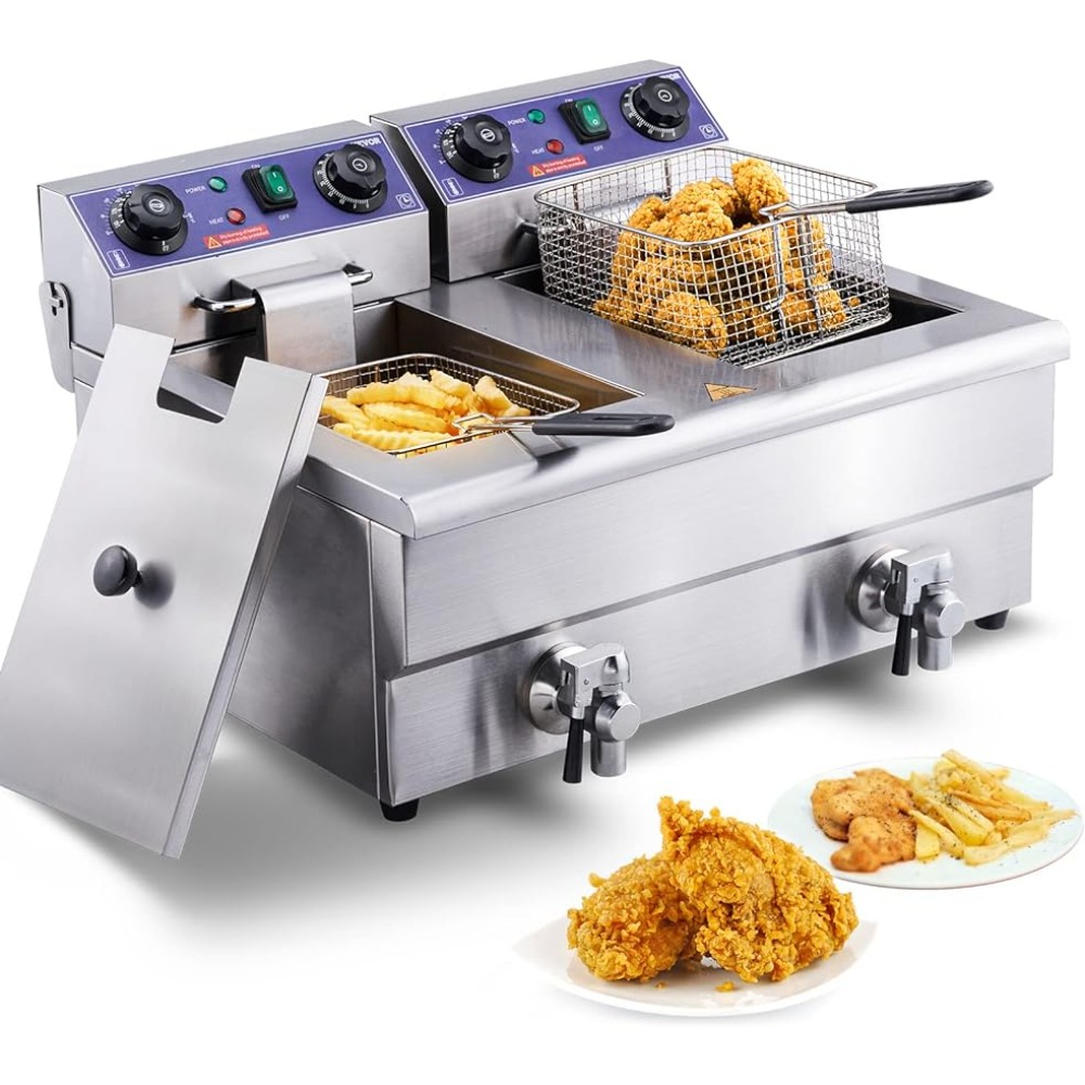 - Hot Food in No Time: Aren’t you tired of slow heat-ups? This commercial electric fryer is equipped with a 1500W heating element in each tank, allowing it to heat oil to your desired temperature in a short time. It’s about to get hot! You can easily cook your food quickly and thoroughly. NOTE: It is recommended to use separate socket plates for each of the two plugs to minimize the risk of unexpected loss of power (please plug into a wall socket rather than a wiring plate-type socket).