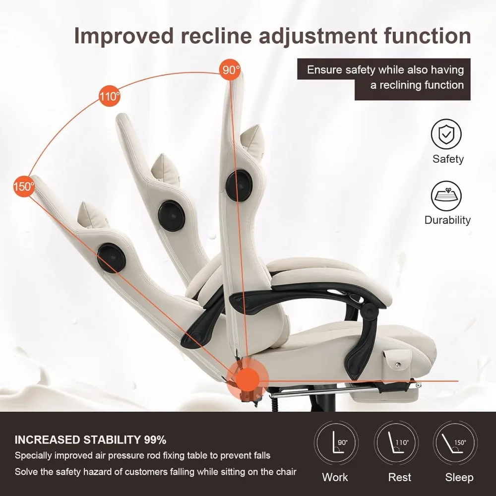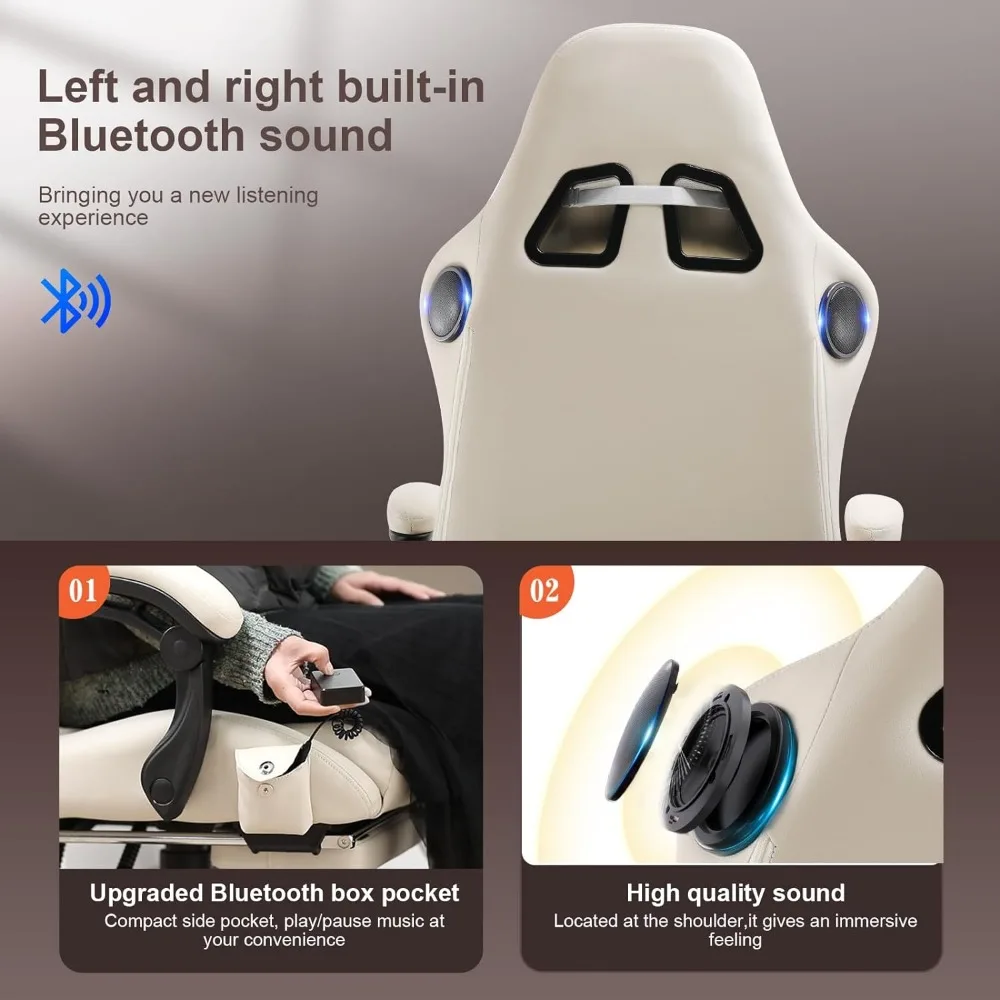 - 【Superior Design Features】The 360°rotating multi-directional racing-car rollers; the maximum inclination angle of the backrest of the gamer chair is 150°, with a retractable padded footrest and linkage armrests. When you’re tired, you can pull out the footrest, recline the chair back, connect to bluetooth, and lie back in the chair to enjoy 3D surround music. This office gaming chair is your ideal seat for work, study and entertainment.