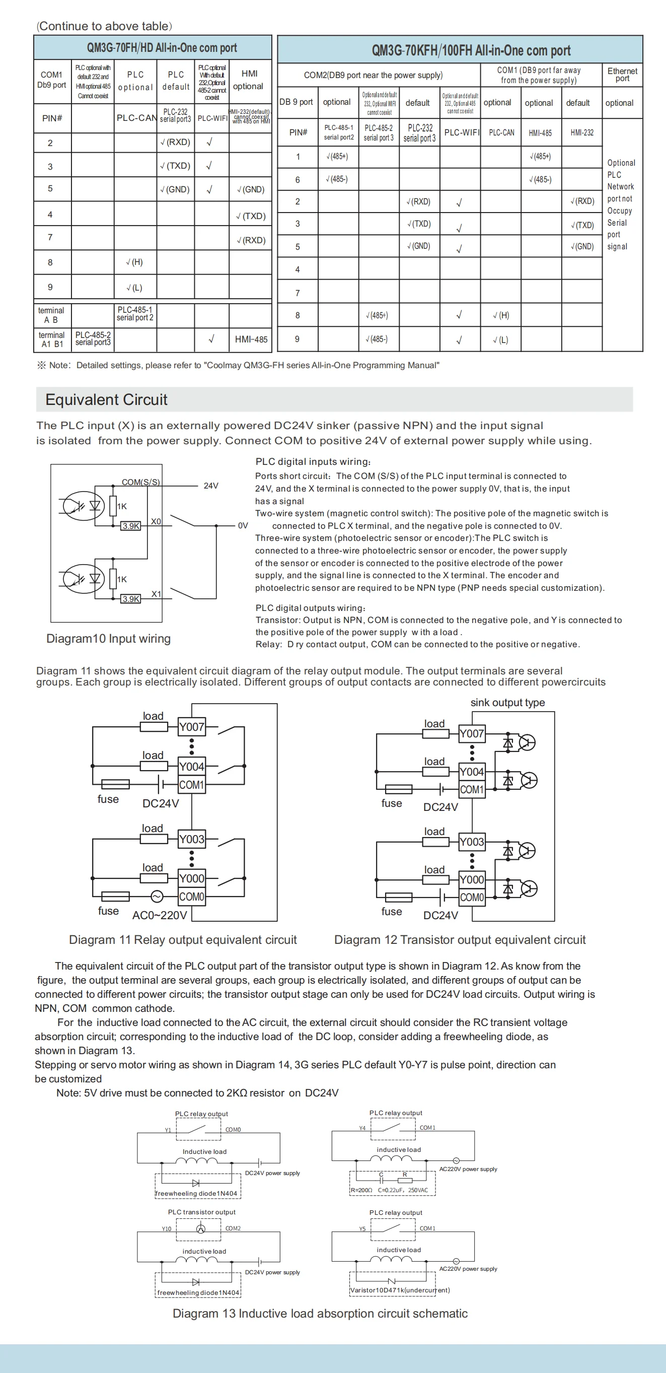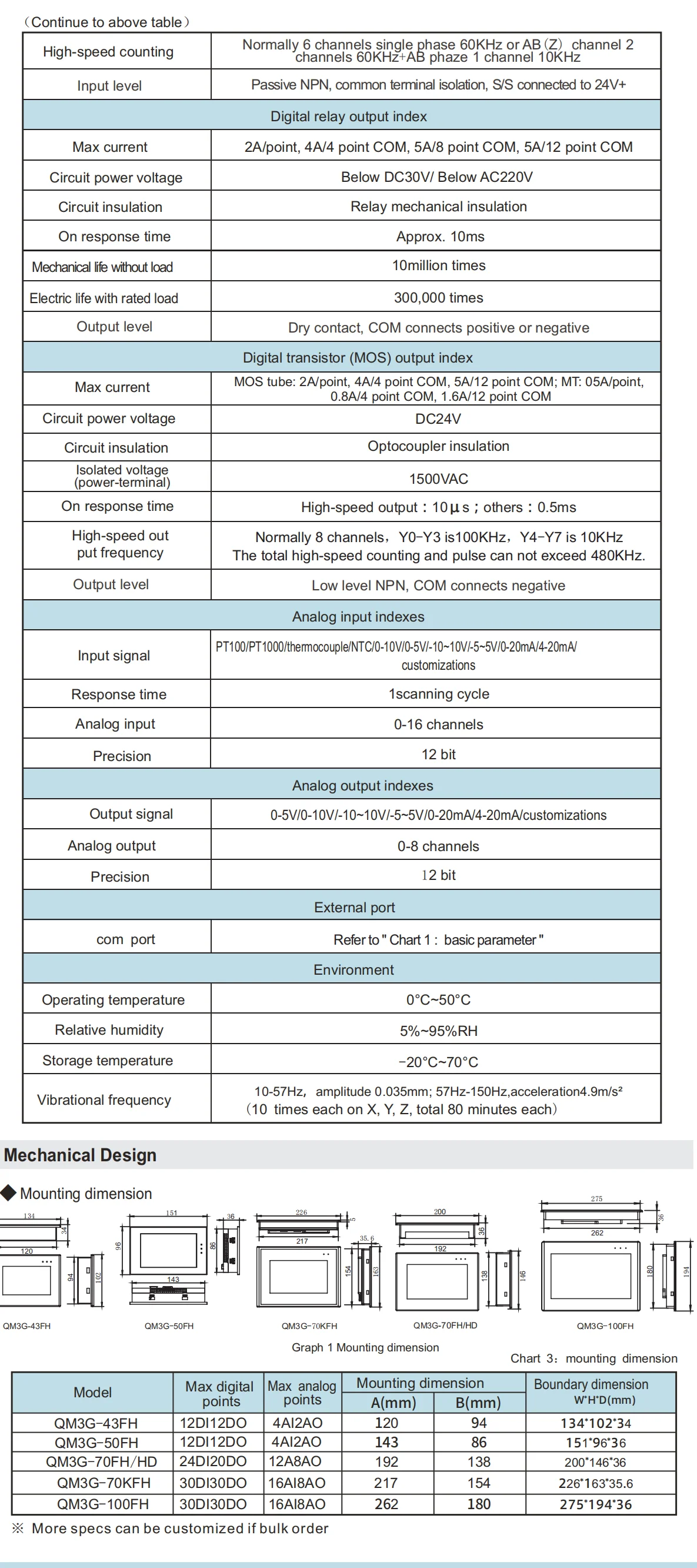 QM3G-100FH-60MT:10inch HMI PLC all in one, 30DI 30DO, transistor outputs,Optional maximum 5 Analog inputs and 2 Analog outputs,1RS232(HMI), 1RS232(PLC),1RS485(PLC),4 High speed pulse output(100KHz,Y0-Y3),4 High speed pulse output(10KHz,Y4-Y7).