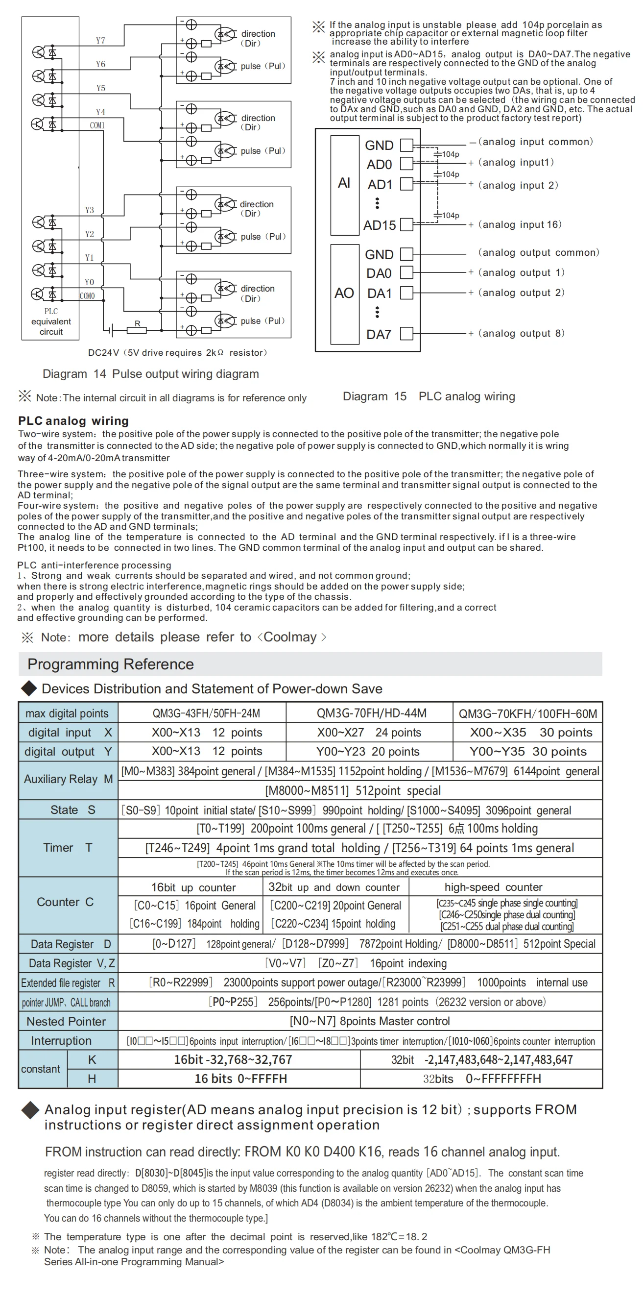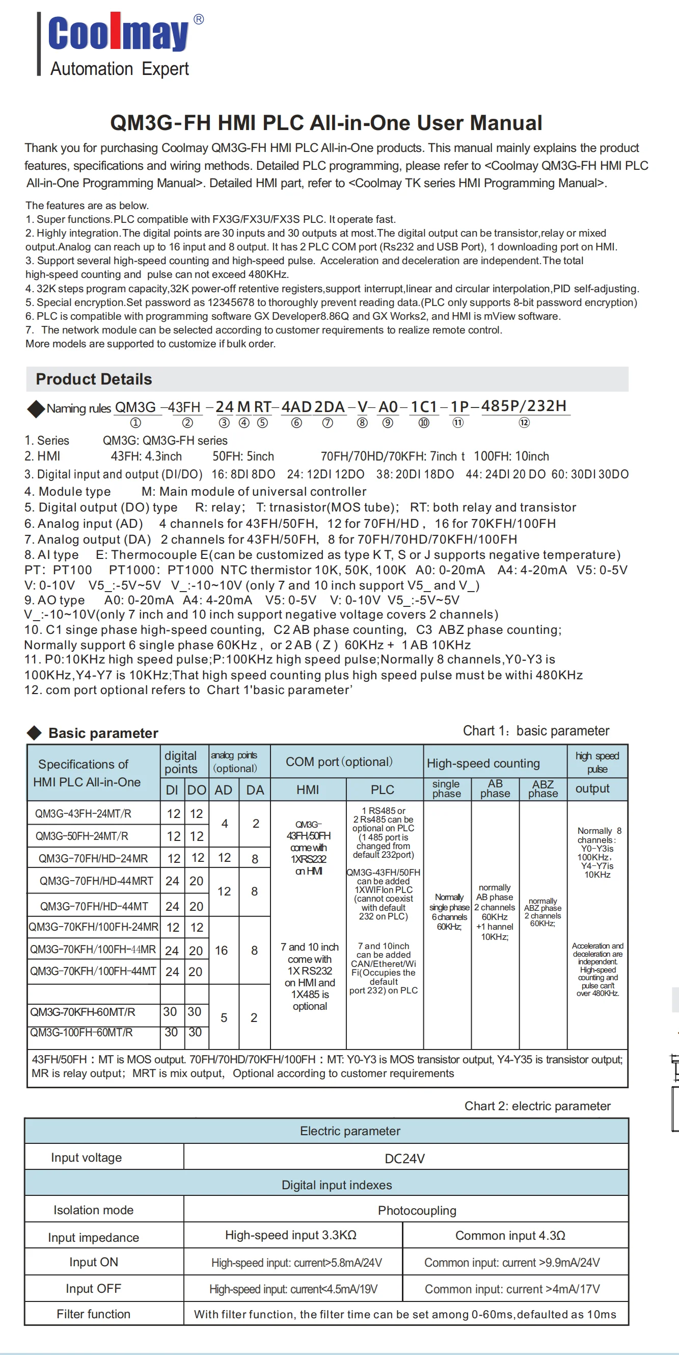 QM3G-50FH-24MT:5inch HMI PLC all in one, 12DI 12DO, transistor outputs,Optional maximum 4 Analog inputs and 2 Analog outputs,1 RS232(HMI),1 RS232(PLC),1RS485(PLC),4 High speed pulse output(100KHz,Y0-Y3),4 High speed pulse output(10KHz,Y4-Y7).