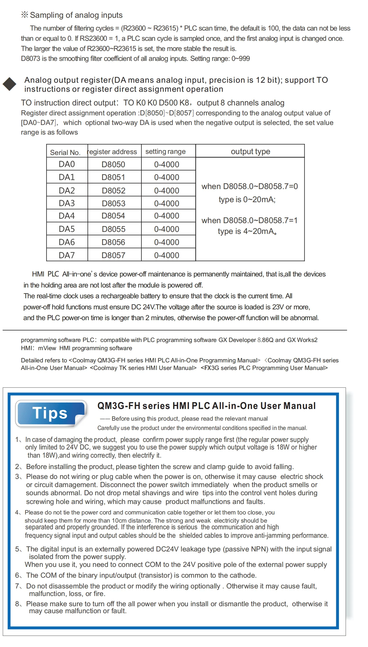 QM3G-43FH-24MT:4.3 inch HMI PLC all in one, 12DI 12DO, transistor outputs,Optional maximum 4 Analog inputs and 2 Analog outputs,1 RS232(HMI),1 RS232(PLC),1RS485(PLC),4 High speed pulse output(100KHz,Y0-Y3),4 High speed pulse output(10KHz,Y4-Y7).