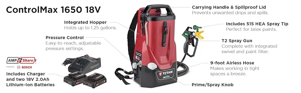 The Titan ControlMax 1650 18V Cordless paint and stain sprayer provides the ultimate mobile spraying solution. The versatile sprayer runs on battery power to spray anywhere your projects take you and can be used as a backpack, stationary unit or carried by hand around the job site. It’s great for jobs like painting or staining outbuildings, parks/recreation areas, line striping, pergolas, cabin structures, playgrounds, garage doors, field markers, touch-up work and more. The sprayer uses High Efficiency Airless technology, which produces up to 55% less overspray than traditional airless sprayers while delivering softer spray, improving control, and providing a more-consistent finish. The sprayer has various helpful capabilities and features to make the project easier including a 9 ft. hose with on-board hose management, variable speed control to fine tune your spraying speed, multiple handle touch points, adjustable and removable straps, onboard storage for tips, and a concealed battery position to protect the battery. It comes with two AmpShare Powered by Bosch 2Ah batteries and a charger (accommodates up to 8Ah), which can be used with all Bosch tools. Each 2Ah battery can spray up to 350 square feet (1.25 gallons/ 1 tank fill) on a single charge (dependent on coating and settings). The ControlMax 1650 18V Cordless sprayer is a great solution for general contractors and handy persons alike who want a versatile spraying system they can take anywhere the job is.