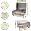 - STAINLESS GRATE PERFECT FOR LARGE CUTS OF MEAT: Stainless grates provide top performance of a large grill in a portable one. Foods cook evenly with a two-burner system, making it ideal for cooking large cuts of meat.