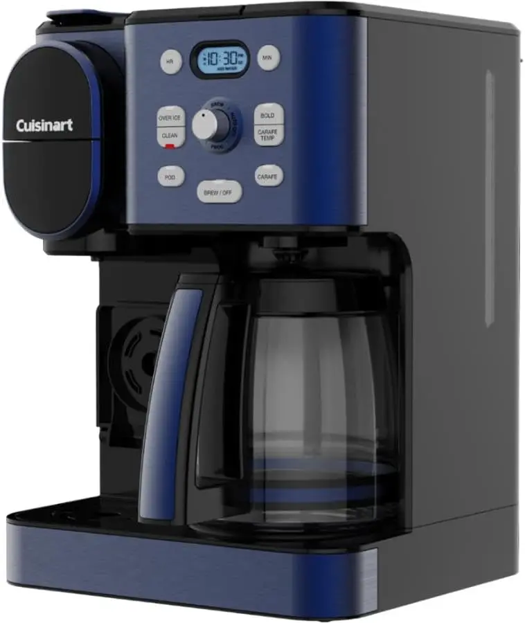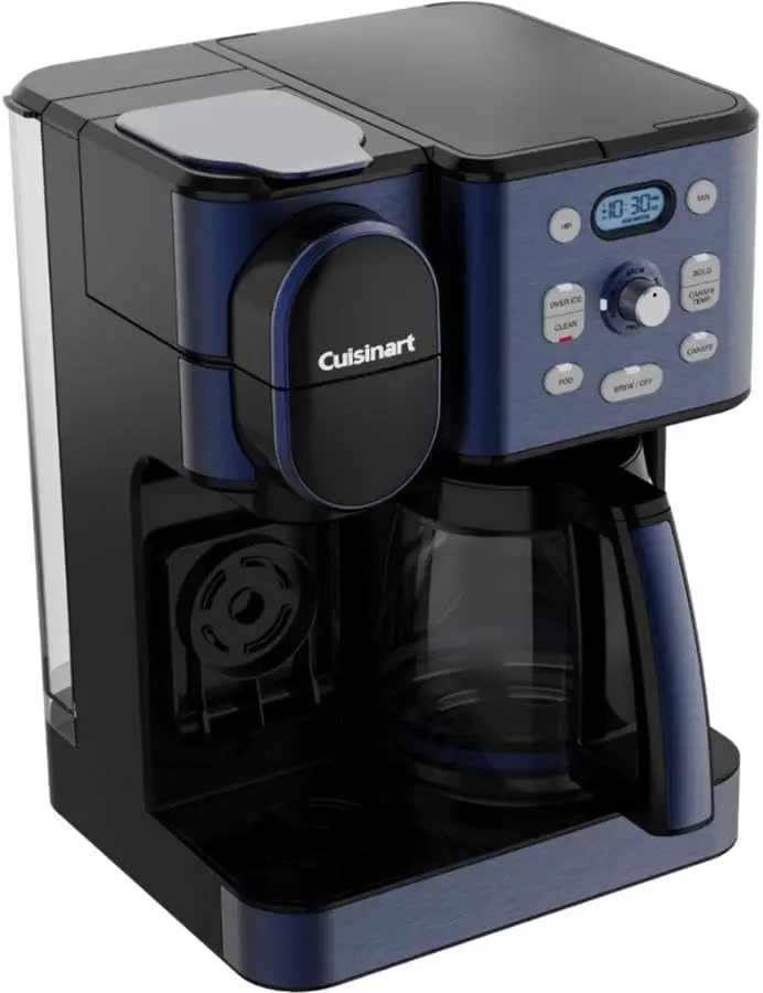 Drip or pod, hot or iced, single cup or carafe for 12-get your coffee, your way with the Cuisinart 2-in-1 Coffeemaker. This kitchen essential for coffee lovers takes home brewing to another level by combining 12-cup carafe and single-serve options in one convenient unit. Brew a full pot 25% faster with Extreme Brew technology. Customize when and how you want your coffee with advanced start, Brew Pause, temperature control, auto-off, and bold flavor settings. Instantly brew a single serving of hot coffee in 5 cup sizes with any pod, or the reusable HomeBarista filter. Or brew over ice for delicious coffee that refreshes! Experience complete brewing versatility and customizable convenience, courtesy of Cuisinart!
