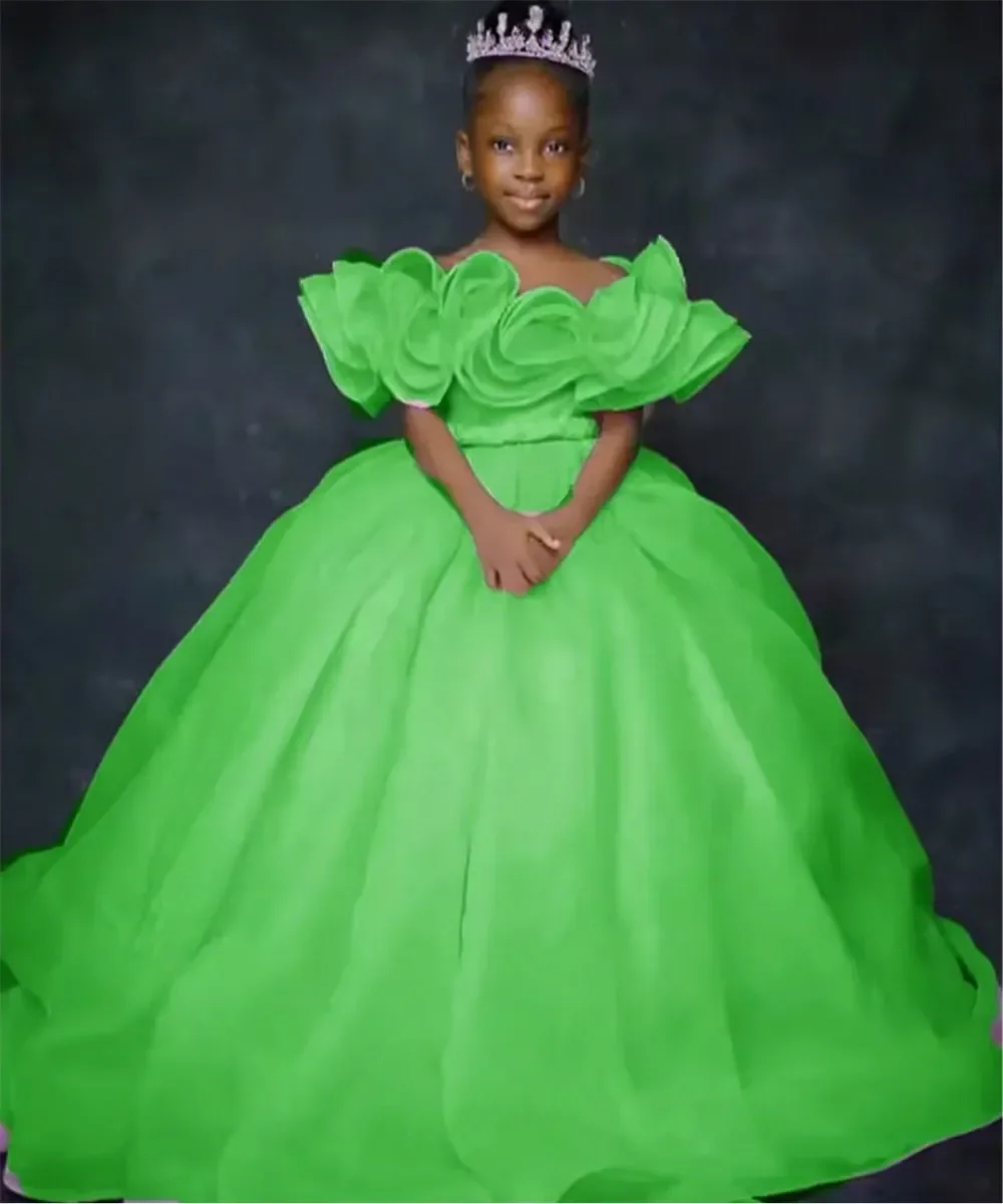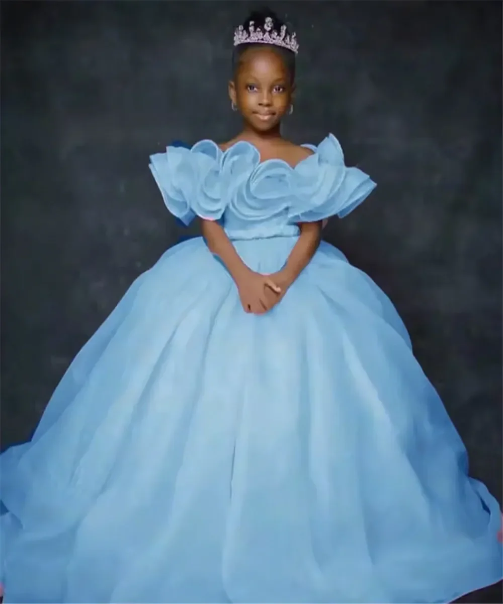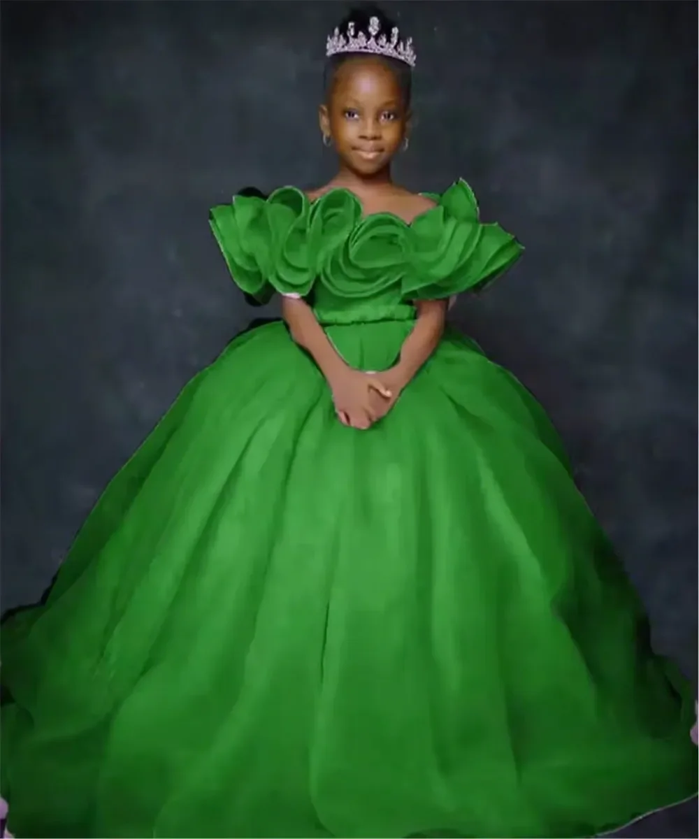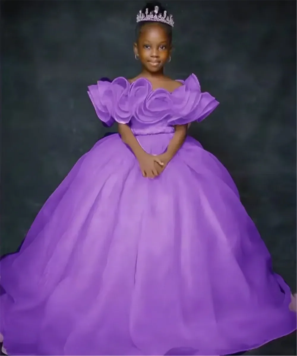 Custom JDY Kids’ Birthday Dress Custom Flower Girl Dress Off-Shoulder Ruffled Tiered Tulle Ball Gown Wedding