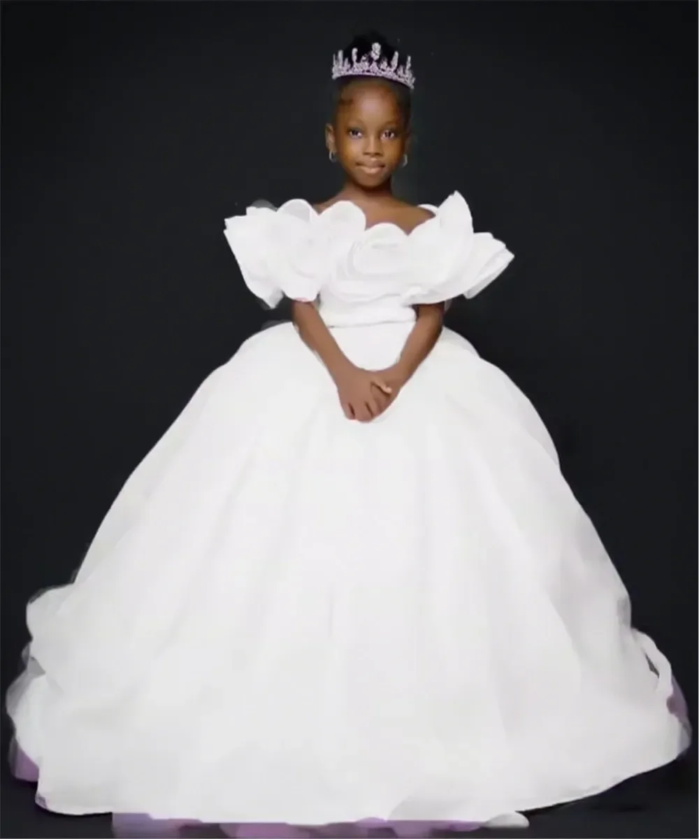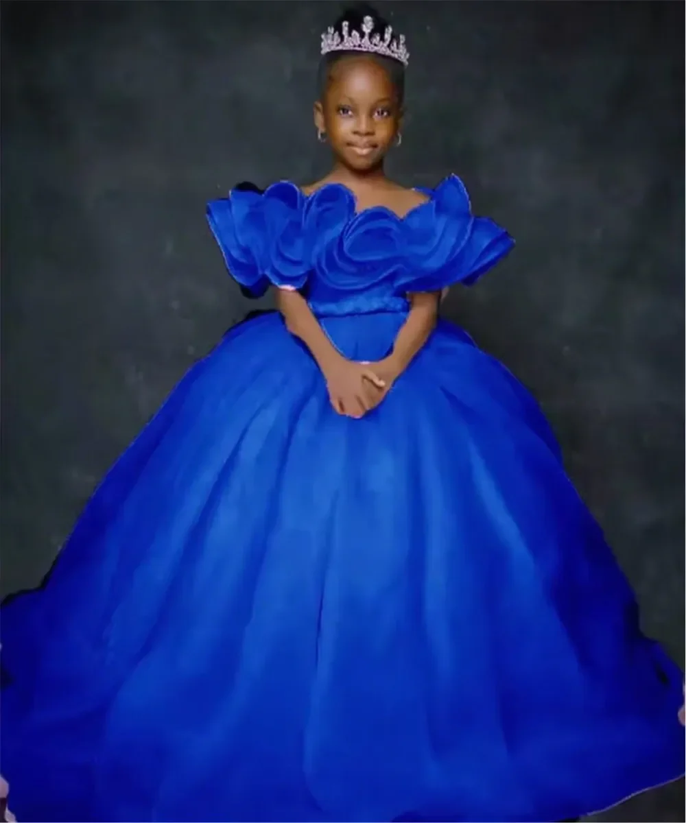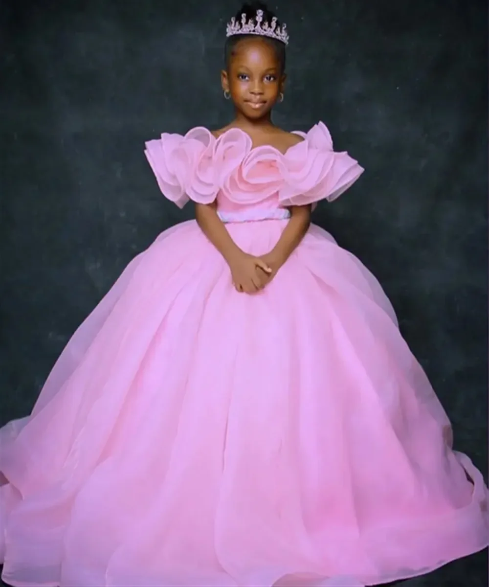 Custom JDY Kids’ Birthday Dress Custom Flower Girl Dress Off-Shoulder Ruffled Tiered Tulle Ball Gown Wedding