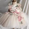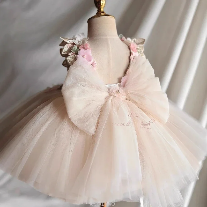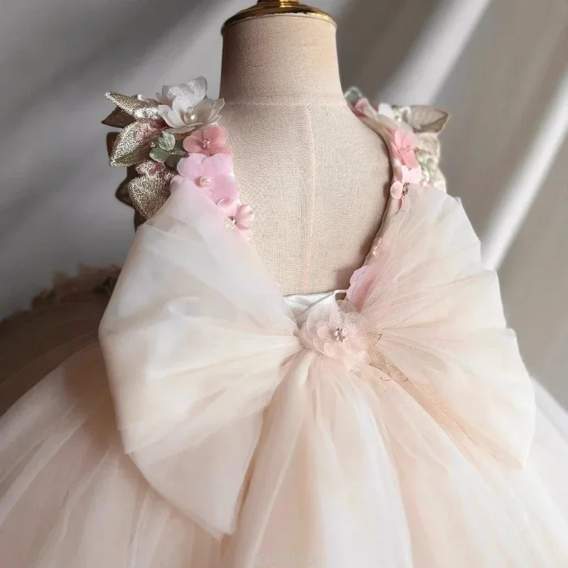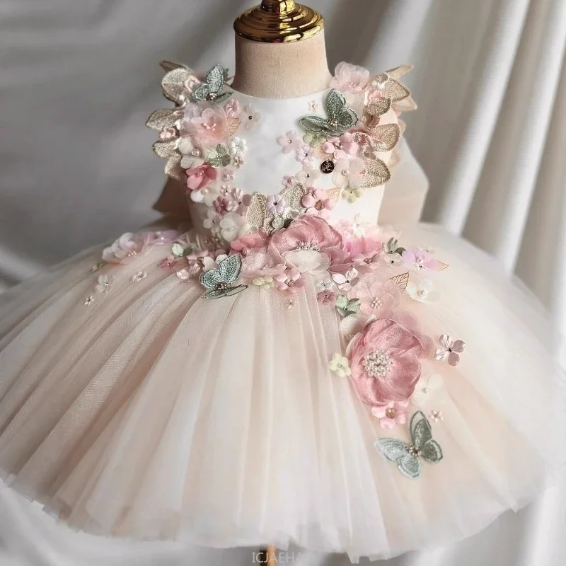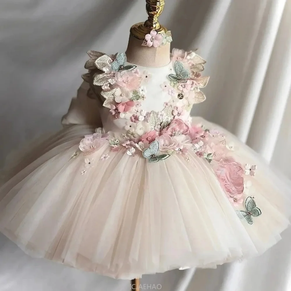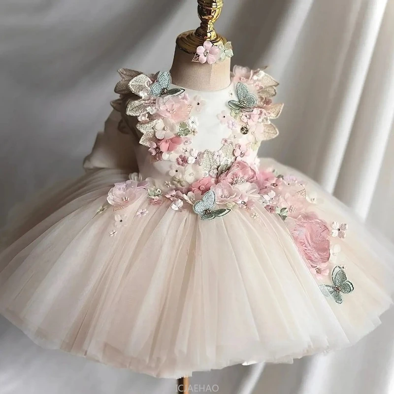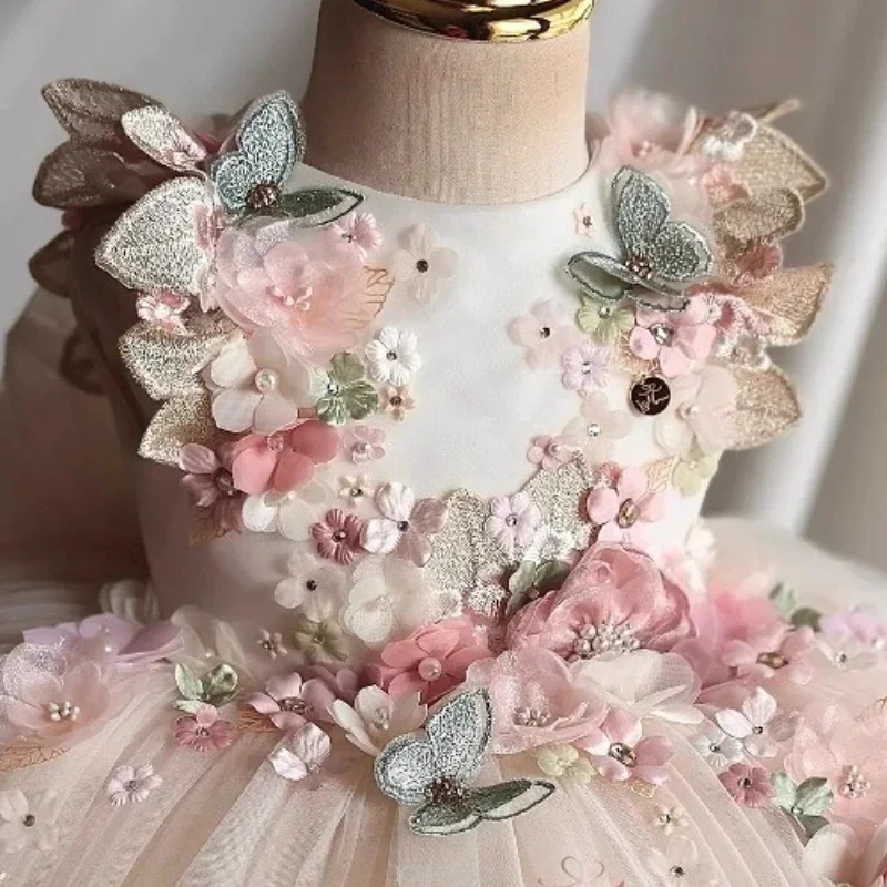 This custom pink floral butterfly tulle flower girl dress offers a unique and personalized touch for your little one’s special occasion.