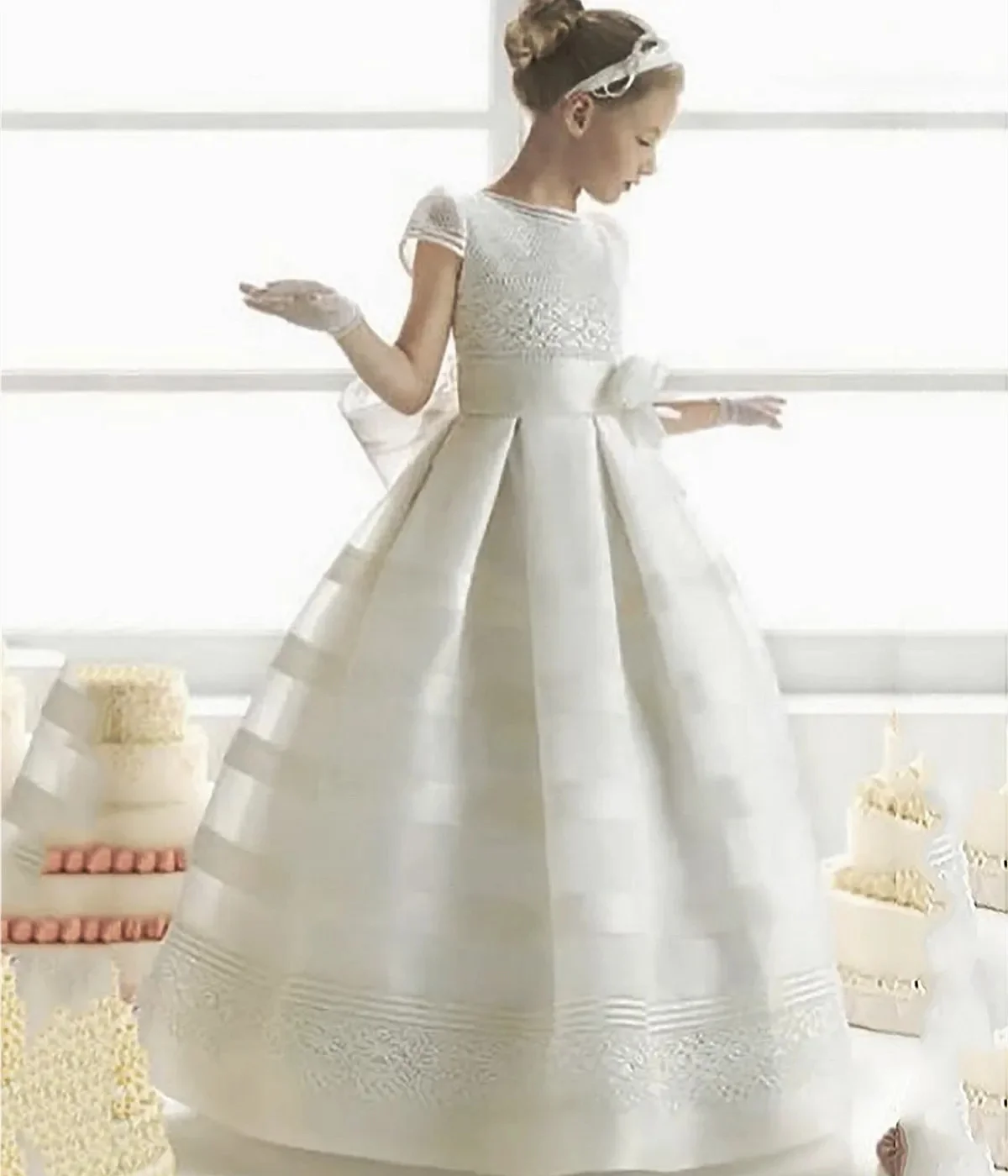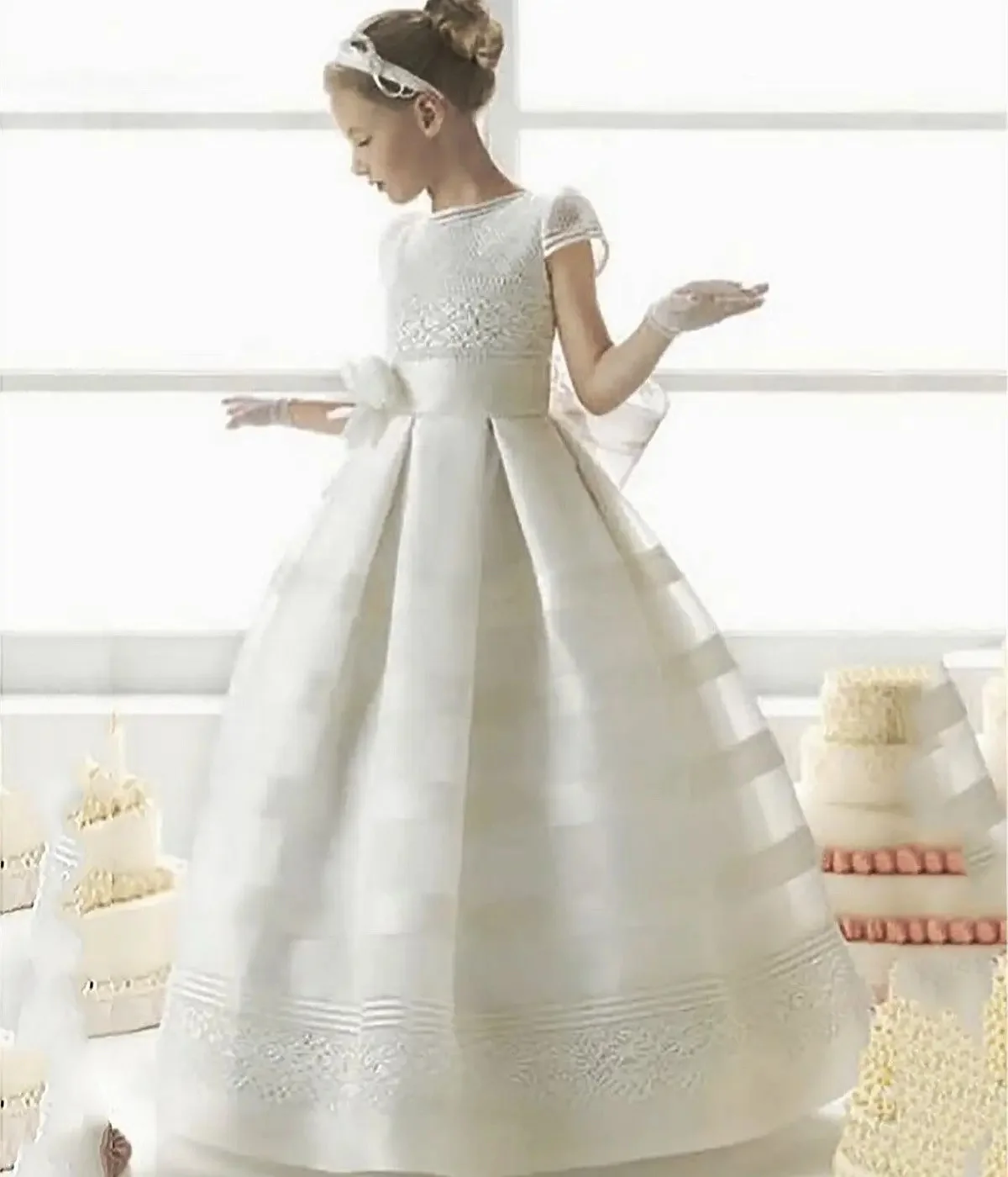 Customized White Flower Girl Dress For Wedding Appliques Tulle Short Sleeve Floor Length Kids Birthday First Communion Gown