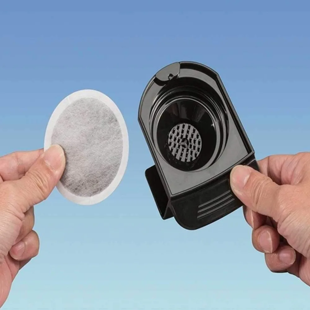 • No paper filters needed; permanent drip filter allows grounds to be poured directly into coffee maker