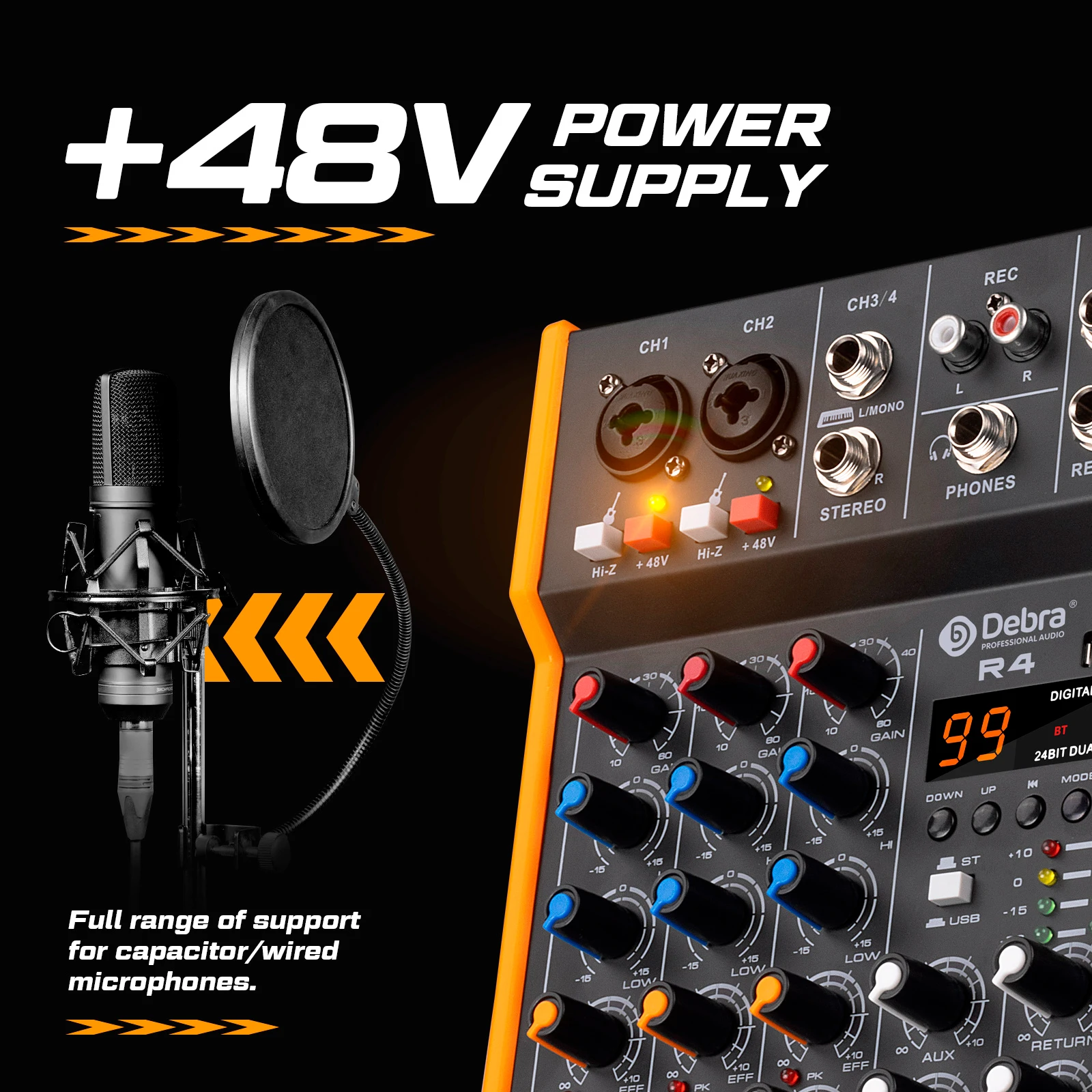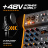 R4/R6 is a portable multi-functional audio mixer that can output through 6.5mm output or TypeC sound card for live mixing or PC recording. 99DSP effects and various reverb preset scene effects allow users to have more and more portable choices. The standard 48V can support condenser microphones or musical instruments, and it has Bluetooth 5.0 and USB input, which is convenient for playing music in a variety of ways. You can also use a mobile power supply for power outdoors. Whether it is an individual user or a small band, R4/R6 is a good mixing partner.