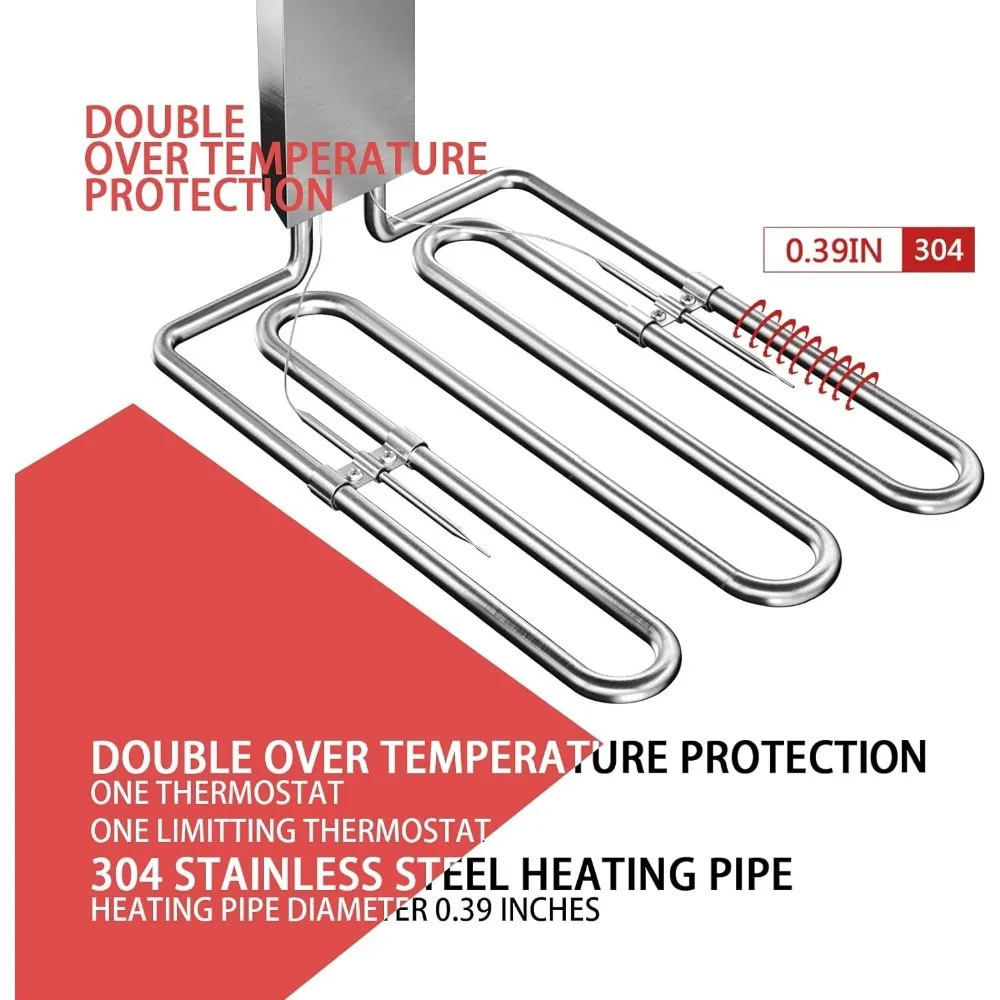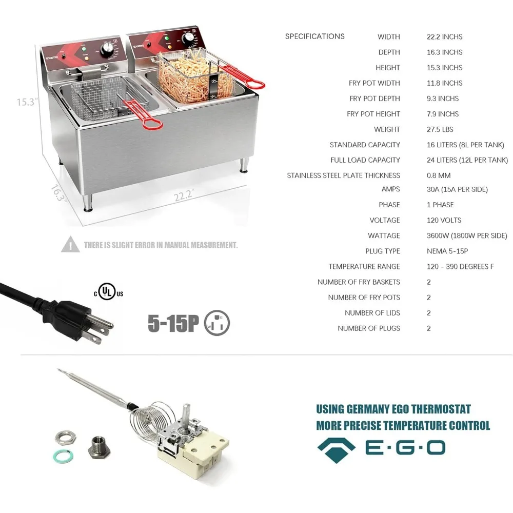 - LARGE CAPACITY – With 2 capacity 12L oil tank, 2 lids and 2 removable large baskets that features compact durable chrome plated stainless steel mesh and cool touch handle prevents excess heat transfer, so even on busy shifts you and your employees can keep working without risk of burns or discomfort. Additionally, the front hook is compatible with most fryers, making it easy to hang the basket up to drain the oil quickly. 4 height-adjustable feet makes the cooking and cleaning more easy