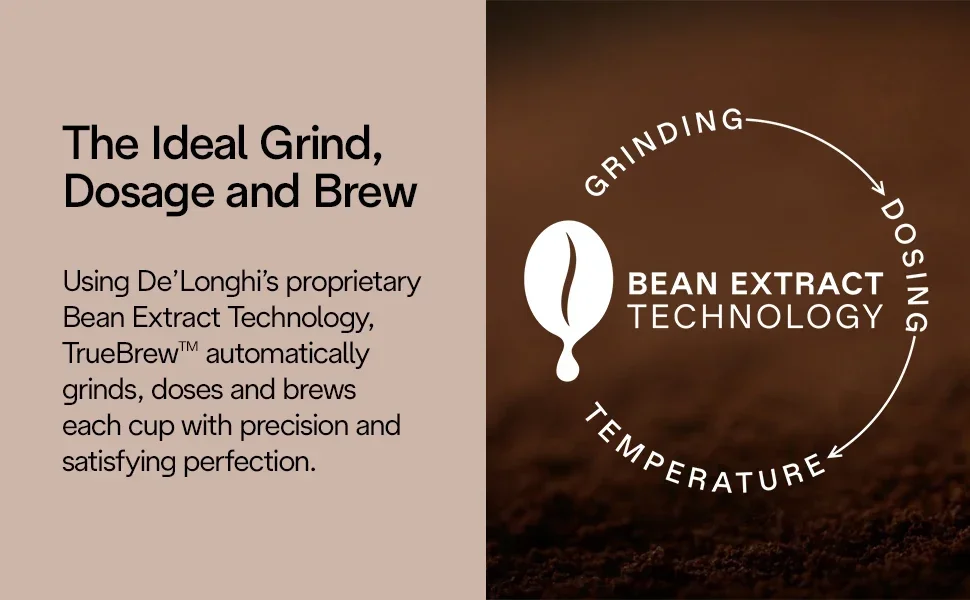 TrueBrew is an innovative, automatic coffee machine that brews drip coffee from fresh, whole coffee beans -all at the touch of a button. TrueBrew is built to suit all of your coffee needs, for consistent, freshly ground coffee, every time. Simply pour in your favorite beans, make your selection, and press “Brew.” Then, TrueBrew takes care of the rest. De’Longhi’s proprietary Bean Extract Technology automatically grinds, doses and brews to capture the coffee’s full flavor and aroma and then crafts the perfect cup for you. You can personalize to your needs with 6 sizes (3, 8, 12, 16, 20, or 24oz cups) and 5 brew styles (Light, Gold, Bold, Espresso-Style or Over-Ice). The Over-Ice style automatically adjusts the dose and brew to create a refreshingly bold & balanced iced coffee. TrueBrew uses whole beans not plastic pods or filters, creating zero waste. The machine packs the used grounds into easily-disposable pucks and the Auto-Clean feature makes clean-up a breeze. Plus, with a Built-In Clock and Auto-On function, you can schedule your perfect cup of coffee to be ready exactly when you want it. TrueBrew combines our most precise and adaptive brewing technology with true one-touch simplicity, bringing you the purest taste possible, exactly how you like it, and all at the press of a button. TrueBrew transforms your at-home coffee experience.