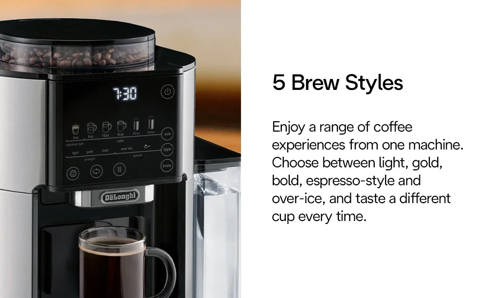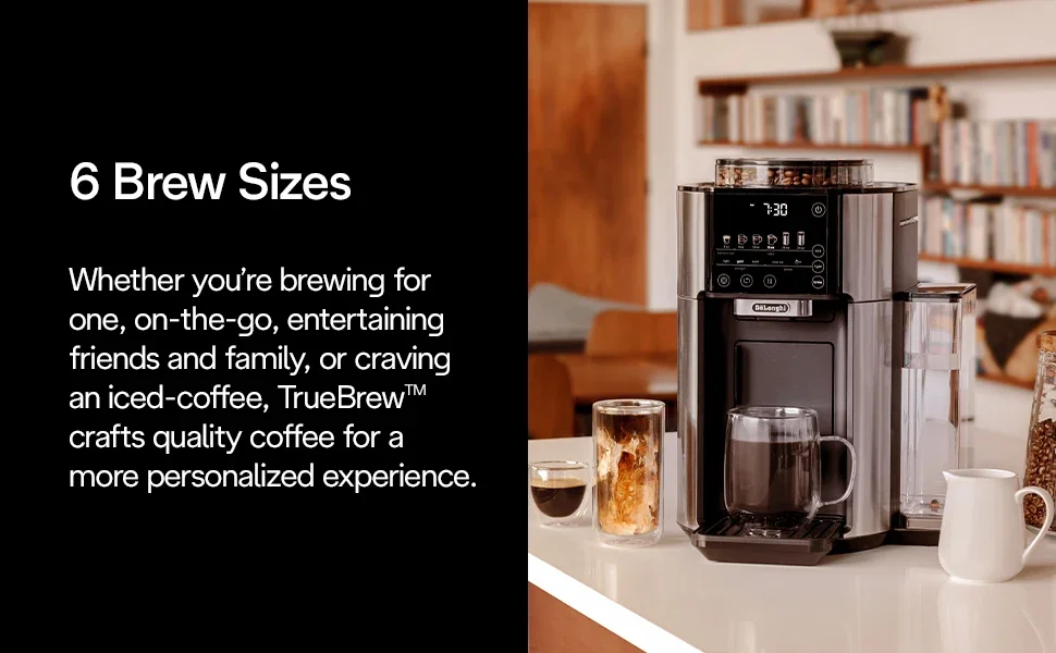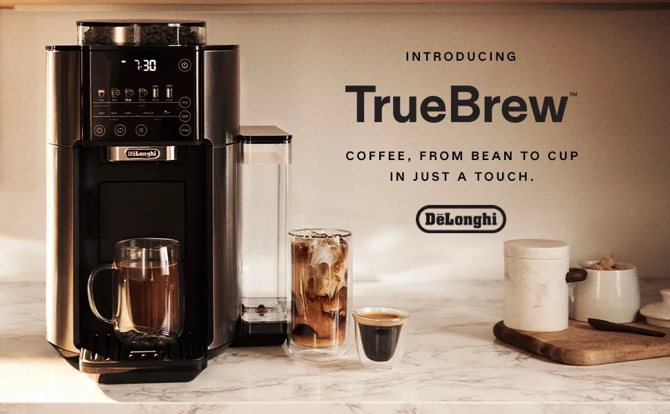 TrueBrew is an innovative, automatic coffee machine that brews drip coffee from fresh, whole coffee beans -all at the touch of a button. TrueBrew is built to suit all of your coffee needs, for consistent, freshly ground coffee, every time. Simply pour in your favorite beans, make your selection, and press “Brew.” Then, TrueBrew takes care of the rest. De’Longhi’s proprietary Bean Extract Technology automatically grinds, doses and brews to capture the coffee’s full flavor and aroma and then crafts the perfect cup for you. You can personalize to your needs with 6 sizes (3, 8, 12, 16, 20, or 24oz cups) and 5 brew styles (Light, Gold, Bold, Espresso-Style or Over-Ice). The Over-Ice style automatically adjusts the dose and brew to create a refreshingly bold & balanced iced coffee. TrueBrew uses whole beans not plastic pods or filters, creating zero waste. The machine packs the used grounds into easily-disposable pucks and the Auto-Clean feature makes clean-up a breeze. Plus, with a Built-In Clock and Auto-On function, you can schedule your perfect cup of coffee to be ready exactly when you want it. TrueBrew combines our most precise and adaptive brewing technology with true one-touch simplicity, bringing you the purest taste possible, exactly how you like it, and all at the press of a button. TrueBrew transforms your at-home coffee experience.