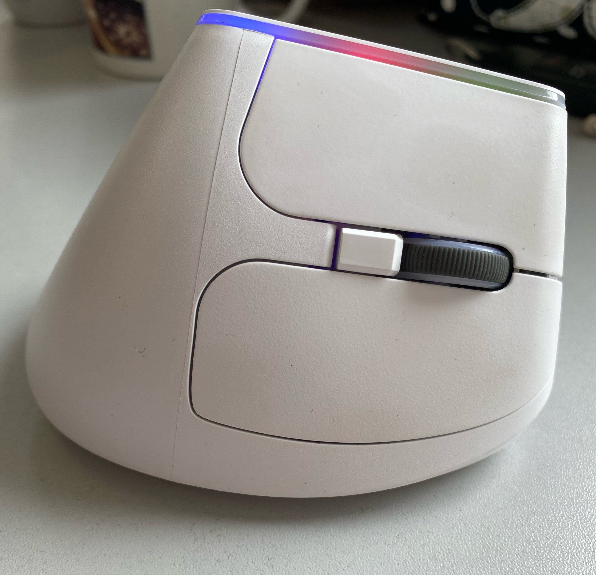 Vertical ergonomic mouse very well built. Uses an AA battery. It is possible to turn off the colored LEDs if you also do not like it. Overall a Good Mouse, good answers from the clicks. I just didn't like the fact that the scroll didn't have locks .. It spins smooth.