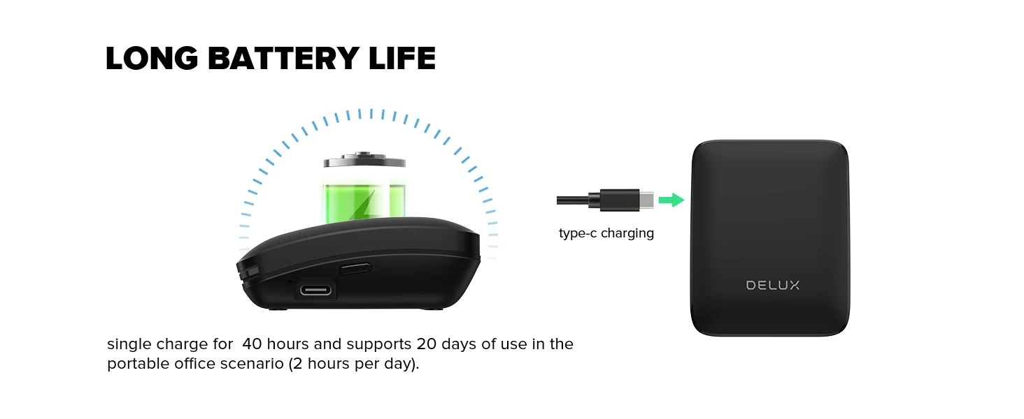 Innovative product. Slides down into tiny form, comfortable when not retracted, USB C charging. has a touch sensitive scroll area. My only complaint is that not all of the touch area records touch input, it would be better if it the entire length responds to touch input. This is my 2nd Delux product and both are innovative.