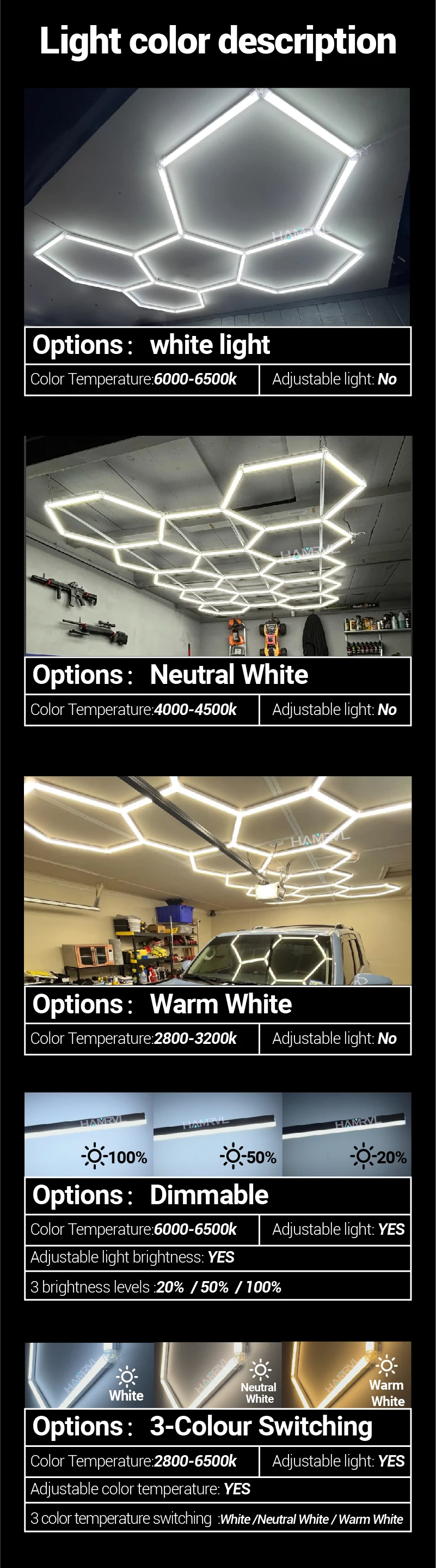 Color temperature:6000-6500K,4000-4500k,2800-3200K(Not supporting dimming)